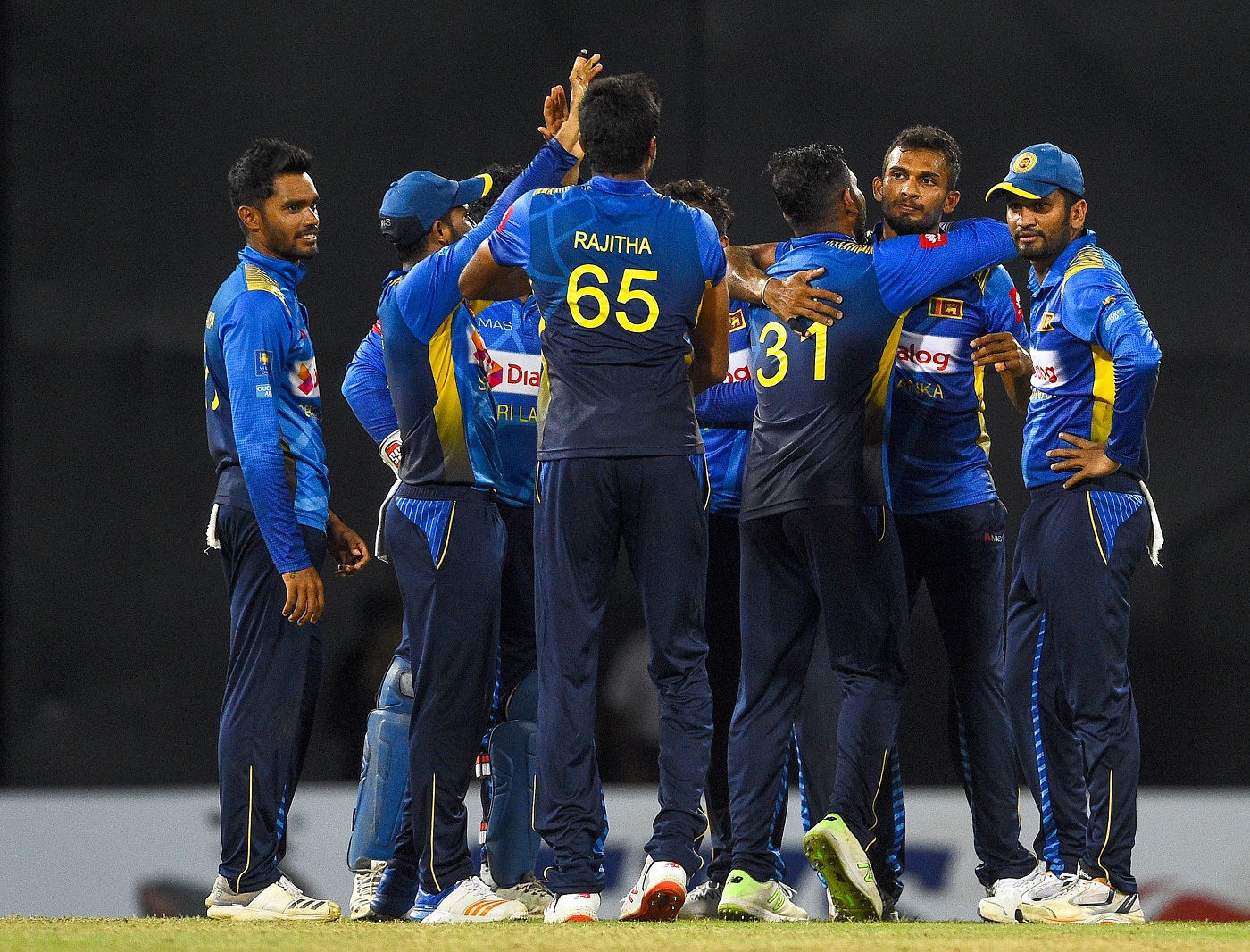 Sri Lankan cricketer Dasun Shanaka (2R) celebrates with teammates after dismissing Bangladeshi cricketer Mushfiqur Rahim during the third one day international (ODI) cricket match of a three-match ODI series between Sri Lanka and Bangladesh at R. Premadasa Stadium in Colombo on July 31, 2019. (Photo by ISHARA S. KODIKARA / AFP) (Photo credit should read ISHARA S. KODIKARA/AFP/Getty Images)