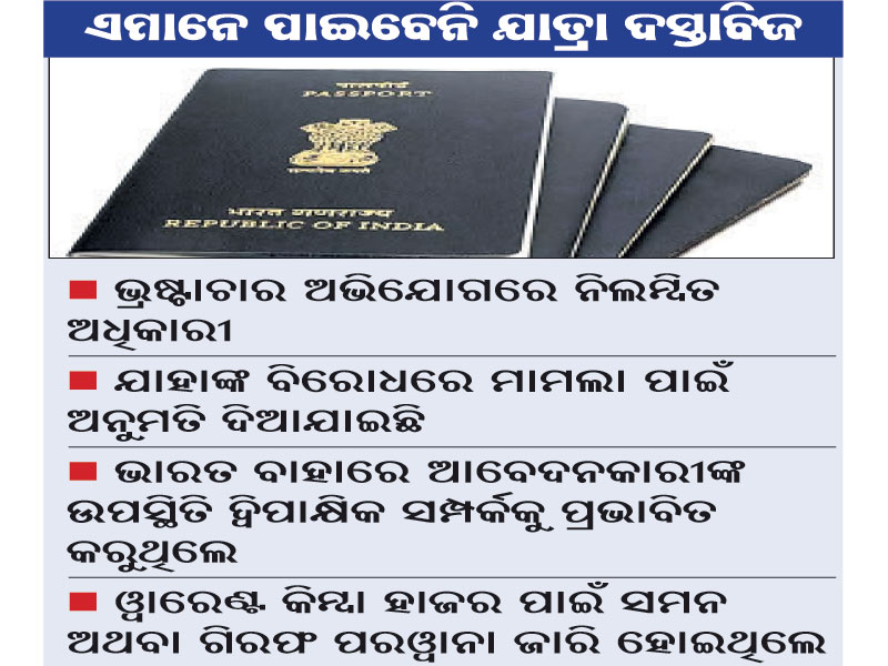 ନୂଆଦିଲ୍ଲୀ,୭ା୩: ଦୁର୍ନୀତିଗ୍ରସ୍ତ ସରକାରୀ ଅଧିକାରୀମାନଙ୍କୁ ଆଉ ମିଳିବ ନାହିଁ ପାସ୍ପୋର୍ଟ। ଯେଉଁ କର୍ମଚାରୀମାନେ ଦୁର୍ନୀତି ଅଭିଯୋଗରେ ନିଲମ୍ବିତ ହୋଇଛନ୍ତି କିମ୍ବା ଯାହାଙ୍କ ବିରୋଧରେ ଭ୍ରଷ୍ଟାଚାର ଅଭିଯୋଗରେ ମାମଲା ରୁଜୁ ପାଇଁ ସରକାର ଅନୁମତି ଦେଇଛନ୍ତି, ସେମାନେ ପାସ୍ପୋର୍ଟ ପାଇପାରିବେ ନାହିଁ। ଏନେଇ କେନ୍ଦ୍ର ସରକାରଙ୍କ ପକ୍ଷରୁ ଏକ ନିର୍ଦ୍ଦେଶନାମା ଜାରି କରାଯାଇଛି।