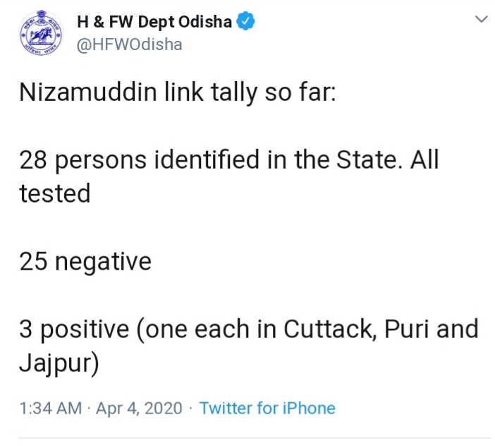 ଭୁବନେଶ୍ୱର, ୪।୪ (ବ୍ୟୁରୋ): ନୂଆଦିଲ୍ଲୀ ନିଜାମୁଦ୍ଦିନରୁ ଫେରିଥିବା ୨୮ଜଣଙ୍କ ମଧ୍ୟରୁ ୩ଜଣଙ୍କର କରୋନା ପଜିଟିଭ ବାହାରିଛି। ଏହି ୩ ଆକ୍ରାନ୍ତ ହେଉଛନ୍ତି କଟକ, ପୁରୀ ଓ ଯାଜପୁରର ବୋଲି ସ୍ୱାସ୍ଥ୍ୟ ବିଭାଗ ପକ୍ଷରୁ ସୂଚନା ଦିଆଯାଇଛି।