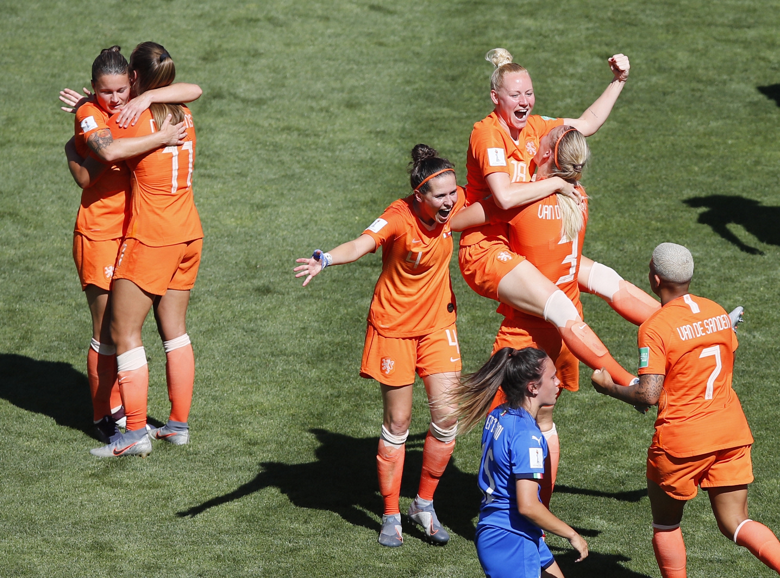 Valenciennes: Netherlands players celebrate at the end of the Women's World Cup quarterfinal soccer match between Italy and the Netherlands, in Valenciennes, France, Saturday, June 29, 2019. AP/PTI(AP6_29_2019_000187B)