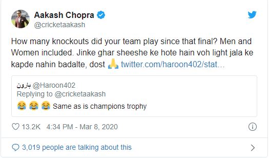ମୁମ୍ବାଇ,୯।୩- ଭାରତୀୟ ମହିଳା ଦଳ ଟି୨୦ ବିଶ୍ୱକପ୍‌ରେ ଅଷ୍ଟ୍ରେଲିଆଠାରୁ ଶୋଚନୀୟ ପରାଜୟ ବରଣ କରିଛି। ଏହି ପରାଜୟ ସତ୍ତ୍ୱେ କିଛି ପ୍ରଶଂସକ ଭାରତୀୟ ଖେଳାଳିଙ୍କ ପ୍ରଦର୍ଶନକୁ ଖୁବ ପ୍ରଶଂସା କରିଛନ୍ତି। କିନ୍ତୁ କିଛି ପାକିସ୍ତାନ ପ୍ରଶଂସକ ଫାଇନାଲରେ ଭାରତୀୟ ଦଳର ପରାଜୟକୁ ହସ୍ୟାସ୍ପଦ ବୋଲି ବିବେଚନ କରିଥିଲେ। ୨୦୧୭ ଆଇସିସି ଚାମ୍ପିୟନ୍ସ ଟ୍ରଫି ଫାଇନାଲ ଭଳି ଭାରତୀୟ ମହିଳା ଦଳ ଦଶା ଭୋଗିଛି ବୋଲି ଟୁଇଟ୍‌ କରିଥିଲେ। ଏହାର କଡ଼ା ଜବାବ ଦେଇଛନ୍ତି ପୂର୍ବତନ ବ୍ୟାଟ୍ସମ୍ୟାନ ତଥା ଏବେକାର ଭାଷ୍ୟକାର। ୨୦୧୭ ଚାମ୍ପିୟନ୍ସ ଟ୍ରଫି ପରେ ତୁମ ପୁରୁଷ ଓ ମହିଳା ଦଳକୁ ମିଶାଇ କେତେଟା ଆଇସିସି ଇଭେଣ୍ଟରେ ନକଆଉଟ୍‌ ମ୍ୟାଚ୍‌ ଖେଳିଚ? ଯେଉଁମାନଙ୍କ ଘର କାଚରେ ତିଆରି, ସେମାନେ ଲାଇଟ୍‌ ଲଗାଇ କପଡ଼ା ବଦଳନ୍ତି ନାହିଁ ବୋଲି ଆକାଶ ଟୁଇଟ୍‌ କରିଛନ୍ତି।