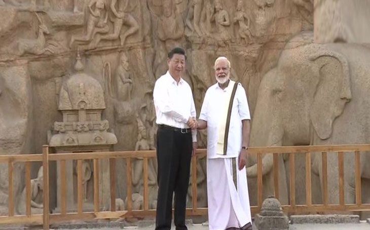 ମାମଲାପୁରମ,୧୧।୧୦: ତାମିଲନାଡୁର ମହାବଳିପୁରମରେ ପ୍ରଧାନମନ୍ତ୍ରୀ ନରେନ୍ଦ୍ର ମୋଦି ଓ ଚାଇନା ରାଷ୍ଟ୍ରପତି ସି ଜିନପିଙ୍ଗଙ୍କ ମଧ୍ୟରେ ସାକ୍ଷାତ୍ ହୋଇଛି। ଏହି ସମୟରେ ମୋଦି ତାମିଲନାଡୁର ପାରମ୍ପରିକ ପୋଷାକରେ ନଜର ଆସିଛନ୍ତି। ମୋଦି ଧଳା ରଙ୍ଗର ସାର୍ଟ ଓ ଧୋତି(ଭେଷ୍ଟି) ପିନ୍ଧିଥିବା ଦେଖାଯାଇଛି। ଏହାସହ ଏକ ଉତ୍ତରୀୟ ମଧ୍ୟ ପକାଇଛନ୍ତି। ଜିନପିଙ୍ଗ ମଧ୍ୟ ସାଦାସିଧା ପୋଷାକ ଅର୍ଥାତ୍ ଧଳା ସାର୍ଟ ଓ କଳା ପ୍ୟାଣ୍ଟ ପିନ୍ଧିଥିବା ଦେଖାଯାଇଛି।