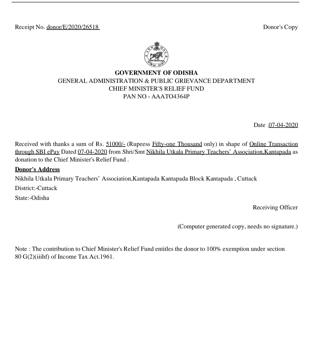 କଣ୍ଟାପଡ଼ା,୯ା୪(ଡି.ଏନ୍.ଏ.) : ମହାମାରୀ କରୋନାରୁ ରକ୍ଷା ପାଇବା ପାଇଁ ସାମାଜିକ ଦୂରତ୍ୱ ଏକମାତ୍ର ବିକଳ୍ପ ହୋଇଥିବାରୁ କେନ୍ଦ୍ର ଓ ରାଜ୍ୟ ସରକାର ଲକ୍ଡାଉନ୍ ଘୋଷଣା କରିଛନ୍ତି। ଫଳରେ ସାଧାରଣ ଲୋକଙ୍କୁ ସହଯୋଗ ପାଇଁ ସରକାରଙ୍କ ଉପରେ ଆର୍ଥତ୍କ ବୋଝପଡୁଛି। ଏପରିସ୍ଥଳେ ବିଭିନ୍ନ ସଂଗଠନ ଓ ବ୍ୟକ୍ତିବିଶେଷ ସରକାରଙ୍କୁ ଆର୍ଥତ୍କ ସହଯୋଗର ହାତ ବଢ଼ାଇଛନ୍ତି। ଏଭଳି ଦୁର୍ଦ୍ଦିନ ସମୟରେ ନିଖିଳ ଉତ୍କଳ ପ୍ରାଥମିକ ଶିକ୍ଷକ ସଂଘ କଣ୍ଟାପଡ଼ା ବ୍ଲକ ପକ୍ଷରୁ ୫୧୦୦୦ଟଙ୍କା ସହାୟତା ରାଶି ପ୍ରଦାନ କରାଯାଇଛି। ଗତ ୭ ତାରିଖରେ ସଂଘ ପକ୍ଷରୁ ଅନ୍ଲାଇନ୍ ମାଧ୍ୟମରେ ଉକ୍ତ ରାଶିକୁ ମୁଖ୍ୟମନ୍ତ୍ରୀଙ୍କ ରିଲିଫ୍ ପାଣ୍ଠିକୁ ପଠଯାଇଛି। ଶିକ୍ଷକମାନଙ୍କର ସହଯୋଗକୁ ସଂଘର ସଭାପତି ଓ ସମ୍ପାଦକ ସାଧୁବାଦ ଜଣାଇଛନ୍ତି। ସେହିପରି ବାଙ୍ଗାଲୋରର ଏକ ସଫ୍ଟଓୟାର କମ୍ପାନୀରେ ଚାକିରି କରୁଥିବା କଟକ ଜିଲା କଣ୍ଟାପଡ଼ା ଗ୍ରାମର ସୁରେନ୍ଦ୍ର ସାହୁ କରୋନା ପରିଚାଳନା ପାଇଁ ପ୍ରଧାନମନ୍ତ୍ରୀ ରିଲିଫ୍ ପାଣ୍ଠିକୁ ୯୯୦୦୦ ହଜାର ଟଙ୍କା ପ୍ରଦାନ କରିଛନ୍ତି। ସେ ଅନ୍ଲାଇନରେ ଏହି ଅର୍ଥ ରାଶିକୁ ପ୍ରଧାନମନ୍ତ୍ରୀଙ୍କ ରିଲିଫ୍ ପାଣ୍ଠିକୁ ପ୍ରଦାନ କରିଥିବା ଜଣାପଡ଼ିଛି।