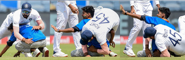 ପୁଣେ,୧୨।୧୦- ଏଠାରେ ଭାରତ ଓ ଦକ୍ଷିଣ ଆଫ୍ରିକା ମଧ୍ୟରେ ଚାଲିଥିବା ଦ୍ୱିତୀୟ ଟେଷ୍ଟର ତୃତୀୟ ଦିନ ଏକ କୌତୂହଳପୂର୍ଣ୍ଣ ଘଟଣା ଦେଖିବାକୁ ମିଳିଛି। ଜଣେ ପ୍ରଶଂସକ ଗ୍ରାଉଣ୍ଡ ବାରିକେଡ ଡେଇଁ ସ୍ଲିପ ଅଞ୍ଚଳରେ ଫିଲ୍ଡିଂ କରୁଥିବା ଭାରତୀୟ ଓପନର ରୋହିତ ଶର୍ମାଙ୍କ ଗୋଡ଼ ଛୁଇଁବାକୁ ଉଦ୍ୟମ କରିଥିଲେ। କିନ୍ତୁ ଅଚାନକ ଏହା ଦେଖି ରୋହିତ ନିୟନ୍ତ୍ରଣ ହରାଇ ପ୍ରଶଂସକଙ୍କ ଉପରେ ପଡ଼ିଯାଇଥିଲେ। ଏହି ଘଟଣା ଦକ୍ଷିଣ ଆଫ୍ରିକାର ସେନୁରାନ ମୁଥୁସାମି ଆଉଟ୍ ହୋଇ ପ୍ୟାଭେଲିଅନ ଫେରିବାବେଳେ ଘଟିଥିଲା। ତେବେ ଏଥିରେ ରୋହିତ ଆହତ ହୋଇନାହାନ୍ତି। ଦକ୍ଷିଣ ଆଫ୍ରିକା ବିପକ୍ଷ ଭାଇଜାଗ ଟେଷ୍ଟରେ ମଧ୍ୟ ଜଣେ ପ୍ରଶଂସକ ଭାରତୀୟ ଅଧିନାୟକ ବିରାଟ କୋହଲିଙ୍କ ସହ ହାତ ମିଳାଇଥିଲେ ଏବଂ ସେଲ୍ଫି ନେବାକୁ ଚେଷ୍ଟା କରିଥିଲେ। ଏଥିପୂର୍ବରୁ ଫିଲ୍ଡରେ ପ୍ରଶଂସକ ପ୍ରବେଶ କରିବା ଯୋଗୁ ଦୁଇ ଦଳ ମଧ୍ୟରେ ଅନୁଷ୍ଠିତ ଦ୍ୱିତୀୟ ଟି୨୦ ମ୍ୟାଚ୍ ଦୁଇ ଥର ବାଧାପ୍ରାପ୍ତ ହୋଇଥିଲା।