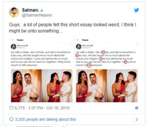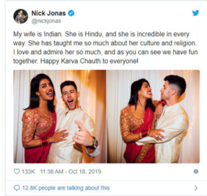 ସ୍ବାମୀ ନିକ୍ ପ୍ରିୟଙ୍କାଙ୍କ ସହ ସୋସିଆଲ ମିଡିଆରେ ଏକ ଫଟୋ ଶେୟାର କରି ଲେଖିଛନ୍ତି, ମୋ’ ସ୍ତ୍ରୀ ଭାରତୀୟ। ସେ ହିନ୍ଦୁ। ମୋତେ ସେ ତାଙ୍କର ସଂସ୍କୃତି, ଧର୍ମ ଏବଂ ପରମ୍ପରା ବିଷୟରେ ବହୁତ କିଛି ଶିଖାଇଛନ୍ତି। ମୁଁ ତାଙ୍କୁ ବହୁତ ଭଲପାଏ। ଆପଣମାନଙ୍କୁ କର୍ବା ଚୌଥ୍ର ଶୁଭକାମନା।