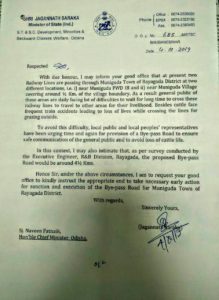 ଶେଷରେ ବ୍ଲକ ବିଜେଡି ସଭାପତି ତଥା ମନ୍ତ୍ରୀଙ୍କ ପ୍ରତିନିଧି ରତନଲାଲ ଜୈନଙ୍କ ଅନୁରୋଧ କ୍ରମେ ଆଦିବାସୀ କଲ୍ୟାଣ ମନ୍ତ୍ରୀ ଜଗନ୍ନାଥ ସାରକା ଚିଠି ନଂ. ୬୮୫/୪.୧୦.୧୯ ମୁନିଗୁଡ଼ା ଲେବଲ କ୍ରସିଂଠାରୁ ବାଇପାସ ରାସ୍ତା ପାଇଁ ମୁଖ୍ୟମନ୍ତ୍ରୀଙ୍କୁ ଚିଠି ଲେଖିଛନ୍ତି। ଏନେଇ ସାଧାରଣରେ ଆନନ୍ଦର ଲହରୀ ଖେଳିଯାଇଛି।