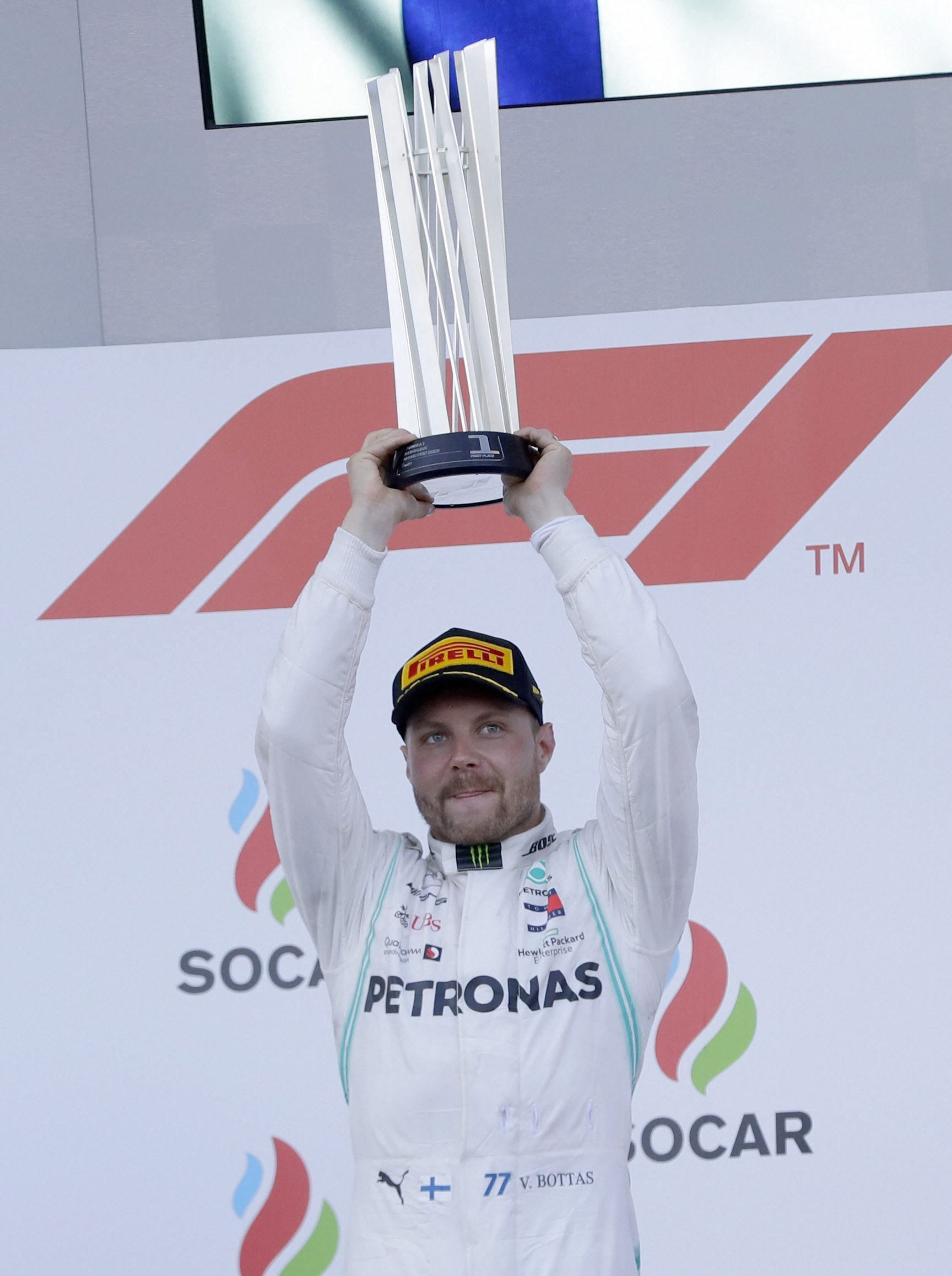 Baku: Mercedes driver Valtteri Bottas of Finland celebrates after winning the Formula One Grand Prix at the Baku Formula One city circuit in Baku, Azerbaijan, Sunday, April 28, 2019