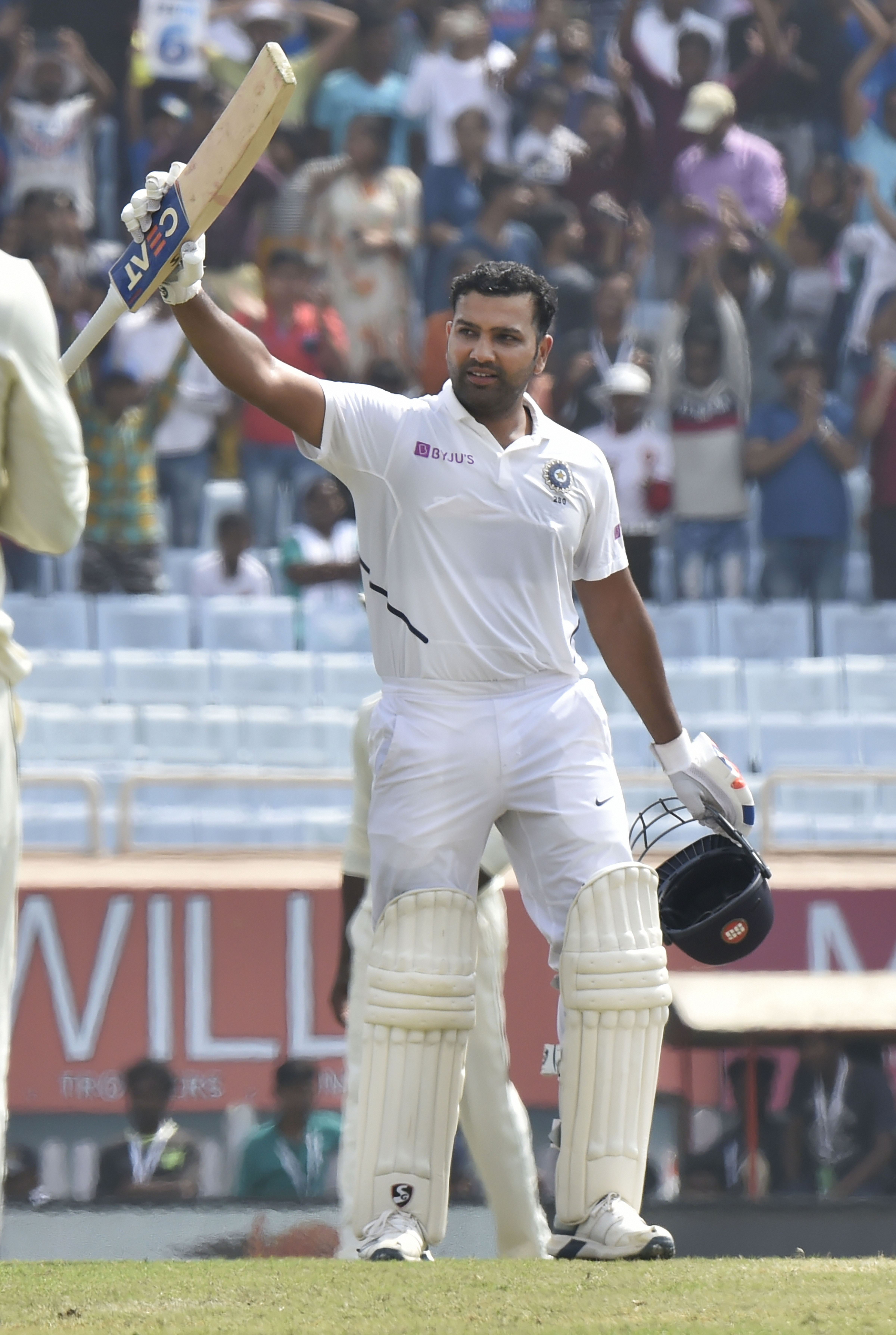 Ranchi: India's Rohit Sharma celebrates his double century during 2nd day of the 3rd cricket test match against South Africa at JSCA Stadium in Ranchi, Sunday, Oct. 20, 2019. (PTI Photo/Ashok Bhaumik) (PTI10_20_2019_000065B)