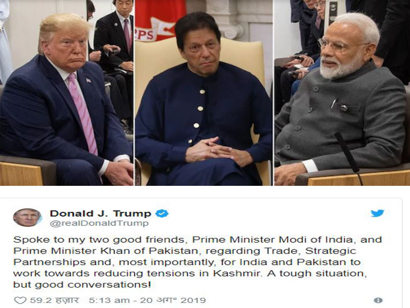 ଓ୍ବାଶିଂଟନ,୨୦।୮: ଭାରତ-ପାକିସ୍ତାନ ମଧ୍ୟରେ ସ୍ଥିତି ସଙ୍କଟ ଜନକ ଥିବା ଆମେରିକା ରାଷ୍ଟ୍ରପତି ଡୋନାଲ୍ଡ ଟ୍ରମ୍ପ୍ ଟୁଇଟ୍ କରି ମଙ୍ଗଳବାର ଭୋର୍ ୫ଟା ୧୩ରେ ଜଣାଇଛନ୍ତି। ଏହା ପୂର୍ବରୁ ଟ୍ରମ୍ପ୍ ପ୍ରଧାନମନ୍ତ୍ରୀ ନରେନ୍ଦ୍ର ମୋଦିଙ୍କ ସହିତ ସୋମବାର ଫୋନ୍ରେ କଥାବାର୍ତ୍ତା ହୋଇଥିଲେ। ପରେ ସେ ପାକିସ୍ତାନ ପ୍ରଧାନ ମନ୍ତ୍ରୀ ଇମ୍ରାନ୍ ଖାଁଙ୍କ ସହିତ କଥାବାର୍ତ୍ତା କରି କୌଣସି ପ୍ରକାର ବିବାଦୀୟ ମନ୍ତବ୍ୟ ନ ଦେବାକୁ ପରାମର୍ଶ ଦେଇଛନ୍ତି। ଦୁଇ ଦେଶ ମଧ୍ୟରେ ଶାନ୍ତି ପାଇଁ ପ୍ରୟାସ ଉପରେ ଟ୍ରମ୍ପ୍ ଗୁରୁତ୍ୱ ଦେଇଛନ୍ତି। ଟ୍ରମ୍ପ୍ କହିଛନ୍ତି ଯେ ସ୍ଥିତି ସଙ୍କଟ ଜନକ ଥିଲେ ମଧ୍ୟ ଆଲୋଚନା ଦ୍ୱାରା ଏହାର ସମାଧାନ କରାଯାଇ ପାରିବ।