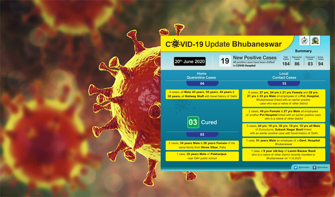 ନୂତନ ଆକ୍ରାନ୍ତକୁ ମିଶାଇ ଭୁବନେଶ୍ୱରରେ ମୋଟ କରୋନା ସଂକ୍ରମିତଙ୍କ ସଂଖ୍ୟା ୧୮୪ ହୋଇଛି। ସେଥିରୁ ୯୪ ଆକ୍ଟିଭ୍ କେସ୍ ରହିଥିବା ବେଳେ ୮୬ଜଣ ସୁସ୍ଥ ହୋଇ ଘରକୁ ଫେରିଛନ୍ତି। ୩ଜଣଙ୍କ ମୃତ୍ୟୁ ଘଟିଛି।