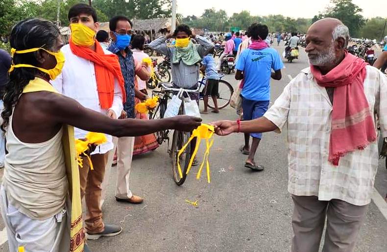 ବରଗଡ଼ ଅଫିସ୍,୧୬।୪- କରୋନା(କୋଭିଡ୍-୧୯) ଭୂତାଣୁ ସଂକ୍ରମଣକୁ ପ୍ରତିହତ କରିବା ଲକ୍ଷ୍ୟରେ ମୁହଁରେ ମାସ୍କ, ଗାମୁଛା କିମ୍ବା ରୁମାଲ ବାନ୍ଧିବା ଉପରେ ଗୁରୁତ୍ୱ ଦିଆଯାଇଛି । ଏହି କ୍ରମରେ ଗୁରୁବାର ବରଗଡ଼ ଜିଲା ସୋହେଲା ବ୍ଲକ ଘେଁସ୍ ବଜାରରେ ପଦ୍ମଶ୍ରୀ ହଲଧର ନାଗ ଲୋକଙ୍କୁ ମାସ୍କ ବଣ୍ଟନ କରିଥିଲେ । ସେ କହିଛନ୍ତି, କରୋନା ମହାମାରୀ ରୂପ ନେଇଛି । ଏହାକୁ ରୋକିବା ପାଇଁ ସମ୍ମିଳିତ ଉଦ୍ୟମ ଲୋଡ଼ା । ଉଭୟ ରାଜ୍ୟ, କେନ୍ଦ୍ର ସରକାର ଏଥିପାଇଁ ସମାଜିକ ଦୂରତ୍ୱ, ମୁହଁରେ ମାସ୍କ ବାନ୍ଧିବା, ଜରୁରୀ ପରିସ୍ଥିତିରେ ଘରୁ ନ ବାହାରିବାକୁ ବାରମ୍ବାର ପରାମର୍ଶ ଦେଉଛନ୍ତି । ଆମେ ବଞ୍ଚିଲେ ଯାଇ ଦେଶ ବଞ୍ଚିବ । ଫଳରେ ସରକାରଙ୍କ ଏହି ବାର୍ତ୍ତା ଲୋକଙ୍କ ପାଖକୁ ପହଞ୍ଚାଇବା ସହିତ ସେ ମାସ୍କ ବଣ୍ଟନ କରିଥିବା କହିଥିଲେ । ଭାଜପା ନେତା ଇରାସିସ୍ ଆଚାର୍ଯ୍ୟଙ୍କ ସହାୟତାରେ ଏହା ଲୋକଙ୍କୁ ବଣ୍ଟନ କରାଯାଇଥିଲା ବୋଲି ହଲଧର କହିଛନ୍ତି ।