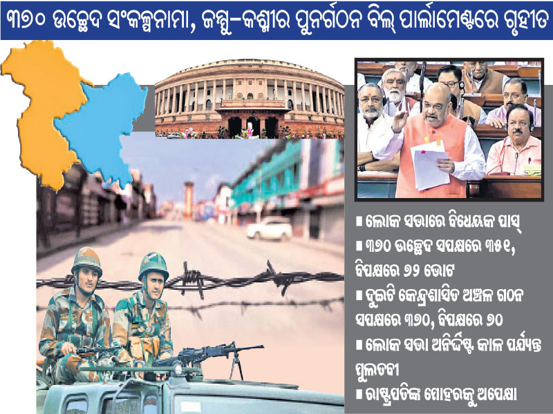 ଜମ୍ମୁ-କଶ୍ମୀରକୁ ସ୍ବତନ୍ତ୍ର ରାଜ୍ୟ ମାନ୍ୟତା ପ୍ରଦାନ କରୁଥିବା ସମ୍ବିଧାନର ଅନୁଚ୍ଛେଦ ୩୭୦କୁ ସୋମବାର କେନ୍ଦ୍ର ସରକାର ଉଚ୍ଛେଦ କରିଥିଲେ। ଏନେଇ ରାଷ୍ଟ୍ରପତିଙ୍କ ଅଧିସୂଚନା ଜାରି ହୋଇଥିବା ରାଜ୍ୟ ସଭାରେ ସ୍ବରାଷ୍ଟ୍ରମନ୍ତ୍ରୀ ଅମିତ୍‌ ଶାହ ସୂଚନା ଦେଇ ସଂକଳ୍ପନାମାକୁ ଆଗତ କରିଥିଲେ। ଉଚ୍ଚସଦନରେ ଏହା ବହୁମତରେ ପାସ୍‌ ହୋଇଥିଲା। ସେହିପରି ଜମ୍ମୁ-କଶ୍ମୀର ପୁନର୍ଗଠନ ବିଲ୍‌, ୨୦୧୯ ମଧ୍ୟ ରାଜ୍ୟ ସଭାର ଅନୁମୋଦନ ପାଇଥିଲା। ସ୍ବରାଷ୍ଟ୍ରମନ୍ତ୍ରୀ ଶାହ ମଙ୍ଗଳବାର ଏହି ସଂକଳ୍ପନାମା ଓ ବିଲ୍‌କୁ ମଙ୍ଗଳବାର ଲୋକ ସଭାରେ ଆଗତ କରିଥିଲେ। ବିତର୍କ ଉପରେ ବିବୃତି ରଖି ଶାହ କହିଥିଲେ, ପାକିସ୍ତାନ ଅଧିକୃତ କଶ୍ମୀର (ପିଓକେ)କୁ ଭାରତ ଦଖଲ କରିବା ପାଇଁ ଉଦ୍ୟମ ଜାରି ରଖିବ। ବିଚ୍ଛିନ୍ନତାବାଦୀ ସଙ୍ଗଠନ ହୁରିୟାତ୍‌ କନ୍‌ଫରେନ୍ସ ସହିତ ଆଲୋଚନା କରିବାର ପ୍ରଶ୍ନ ଉଠୁନାହିଁ। କିନ୍ତୁ କଶ୍ମୀରବାସୀଙ୍କ ସହ କଥାବାର୍ତ୍ତା କରିବା ଲାଗି ଆମେ ପ୍ରସ୍ତୁତ। ଜମ୍ମୁ-କଶ୍ମୀରରେ ସ୍ବାଭାବିକ ସ୍ଥିତି ଫେରିଆସିଲେ ଏହାକୁ ରାଜ୍ୟ ମାନ୍ୟତା ଫେରାଇବାରେ ମୋଦି ସରକାର କୁଣ୍ଠାବୋଧ କରିବେ ନାହିଁ। ପିଓକେ ଉପରେ ନିଜର ଅଧିକାର ଦାବିକୁ ଭାରତ ଜାରି ରଖିବ। ଅନୁଚ୍ଛେଦ ୩୭୦ ଜମ୍ମୁ-କଶ୍ମୀର ସହ ଭାରତର ସମ୍ପର୍କକୁ ନେଇ ସନ୍ଦେହ ଓ ଦ୍ୱନ୍ଦ୍ୱ ସୃଷ୍ଟି କରୁଥିଲା। ଏହା ଏକ ଐତିହାସିକ ଭୁଲ୍‌ ନୁହେଁ, ବରଂ ଆମେ ଏକ ଐତିହାସିକ ଭୁଲ୍‌କୁ ସୁଧାରୁଛୁ କହି ଶାହ ବିରୋଧୀଙ୍କ ଅଭିଯୋଗକୁ ଦୃଢ଼ଭାବେ ଖଣ୍ଡନ କରିଥିଲେ। ଅନୁଚ୍ଛେଦ ୩୭୦କୁ ଉଚ୍ଛେଦ କରିବା ଏକ ସାମ୍ପ୍ରଦାୟିକ ଏଜେଣ୍ଡା ନୁହେଁ। ଏଥିରେ ରହିଥିବା ନିୟମ ସଂଖ୍ୟାଲଘୁ, ମହିଳା ଓ ଜନକଲ୍ୟାଣ ବିରୋଧୀ ବୋଲି ସେ ଦର୍ଶାଇଥିଲେ। ଶାହ ଆହୁରି କହିଥିଲେ, ଜମ୍ମୁ-କଶ୍ମୀରରେ ଆତଙ୍କବାଦ ଯୋଗୁ ୧୯୮୯ରୁ ଅଦ୍ୟାବଧି ୪୧,୫୦୦ ଲୋକଙ୍କ ଜୀବନ ଗଲାଣି। ଏଥିପାଇଁ ଅନୁଚ୍ଛେଦ ୩୭୦ ଏବଂ ୩୫ଏ ଦାୟୀ। ସେହିପରି ଗତ ୨ ଦିନ ଧରି ଉପତ୍ୟକାରେ ବିଭିନ୍ନ କଟକଣା ଜାରି ସମ୍ପର୍କରେ ସ୍ବରାଷ୍ଟ୍ରମନ୍ତ୍ରୀ କହିଥିଲେ, ସେଠାରେ ଆଇନଶୃଙ୍ଖଳା ପରିସ୍ଥିତି ଖରାପ ହୋଇନାହିଁ। ଯାହାକିଛି ପଦକ୍ଷେପ ନିଆଯାଇଛି ତାହା କେବଳ ଅସ୍ବାଭାବିକ ସ୍ଥିତି ଏଡ଼ାଇବା ପାଇଁ ଉଦ୍ଦିଷ୍ଟ। ଶେଷରେ ଏହି ସଂକଳ୍ପନାମା ଓ ବିଧେୟକ ପାସ୍‌ ହେବା ପରେ ବାଚସ୍ପତି ଓମ୍‌ ବିର୍ଲା ଲୋକ ସଭାକୁ ଅନିର୍ଦ୍ଦିଷ୍ଟ କାଳ ପର୍ଯ୍ୟନ୍ତ ମୁଲତବୀ ଘୋଷଣା କରିଥିଲେ।