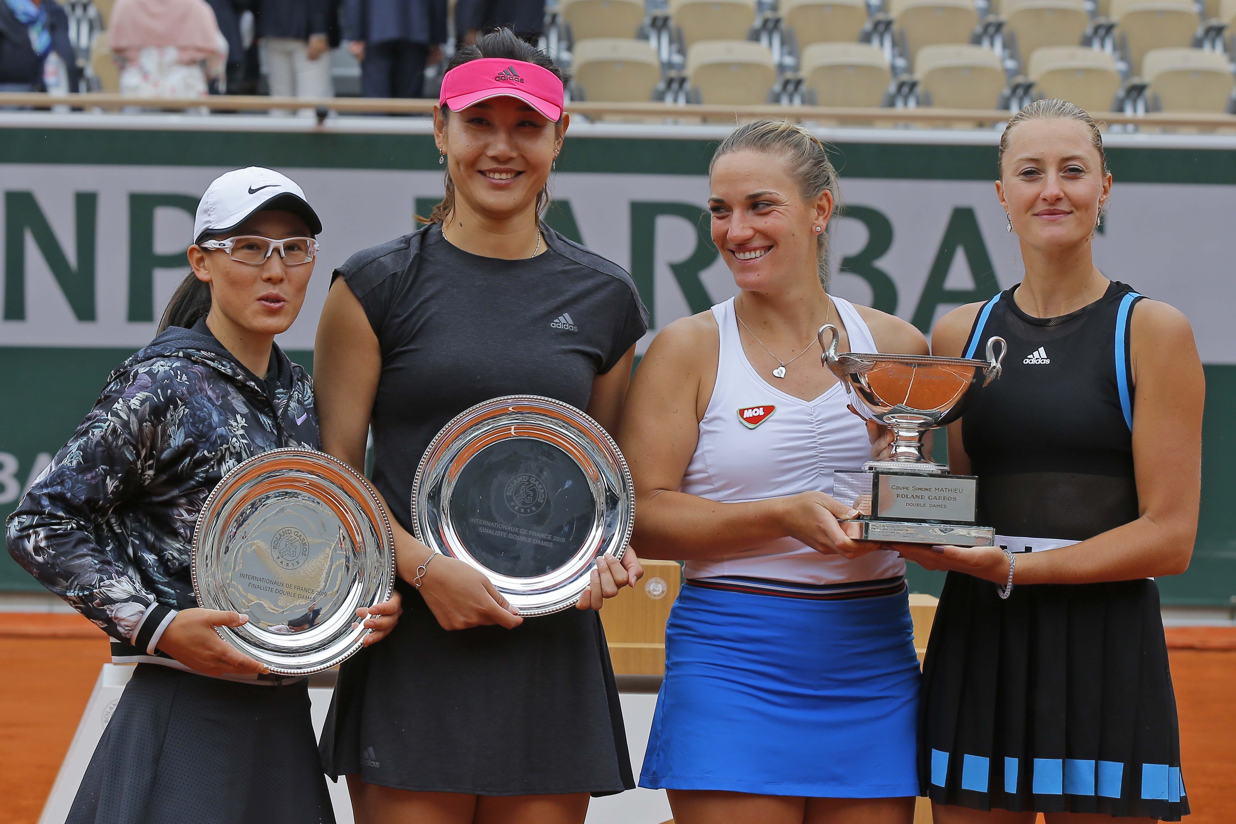 Paris: Hungary's Timea Babos, second right, and France's Kristina Mladenovic, right, hold the trophy after winning the women's doubles final match of the French Open tennis tournament against China's Duan Yingying, second left, and Zheng Saisai, left, at the Roland Garros stadium in Paris, Sunday, June 9, 2019.AP/PTI(AP6_9_2019_000101B)