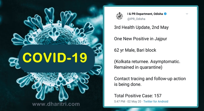 ସୂଚନାଯୋଗ୍ୟ, ରାଜ୍ୟରେ ମେ’ ୧ ତାରିଖ ମଧ୍ୟରାତ୍ରି ପର୍ଯ୍ୟନ୍ତ ମୋଟ୍ ୩୬ ହଜାର ୫୯୩ଟି ଆରଟି ପିସିଆର ଟେଷ୍ଟିଂ ହୋଇଛି । ଏପର୍ଯ୍ୟନ୍ତ ୧୫୭ ଜଣ କରୋନା ପଜିଟିଭ୍ ଚିହ୍ନଟ ହୋଇଥିବା ବେଳେ ୫୬ ଜଣ ସୁସ୍ଥ ହୋଇଛନ୍ତି। କେବଳ ଜଣଙ୍କର ମୃତ୍ୟୁ ଘଟିଛି।