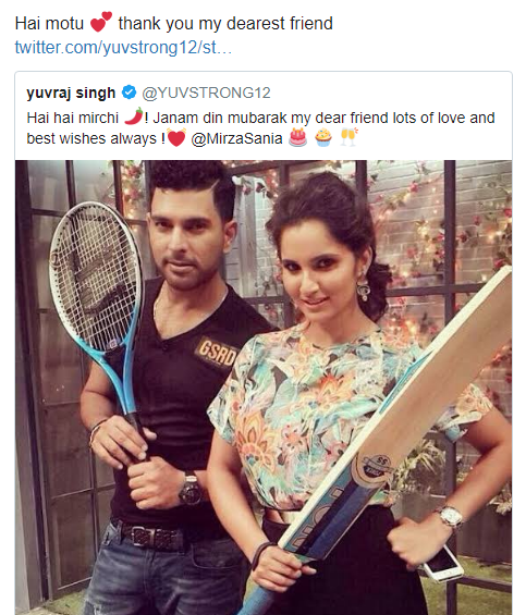 ନୂଆଦିଲ୍ଲୀ,୧୬।୧୧- ଅବସରପ୍ରାପ୍ତ ଅଲରାଉଣ୍ଡ ଯୁବରାଜ ସିଂ (ଯୁବି)ଙ୍କୁ ପାକିସ୍ତାନ ବୋହୂ ତଥା ଦେଶର ଷ୍ଟାର ମହିଳା ଟେନିସ ଖେଳାଳି ସାନିଆ ମିର୍ଜା ମୋଟୁ ବୋଲି କହିଛନ୍ତି। ଗତ ଶୁକ୍ରବାର ସାନିଆ ନିଜର ୩୩ତମ ଜନ୍ମଦିନ ପାଳନ କରିଛନ୍ତି। ଏହି ଅବସରରେ ଯୁବି ବନ୍ଧୁ ସାନିଆଙ୍କୁ ଟୁଇଟ୍‌ କରି ଜନ୍ମଦିନର ଏକ ଫଟୋ ଶେୟାର କରି ଶୁଭେଚ୍ଛା ଜଣାଇଥିଲେ। ଏଥିରେ ଯୁବି ଲେଖିଥିଲେ, ହାଇ ହାଇ ମିର୍ଚି। ମୋ ବନ୍ଧୁଙ୍କ ପାଇଁ ଜନ୍ମଦିନର ଅନେକ ଅନେକ ସୁଭକାମନ ଓ ଭଲପାଇବା। ଉକ୍ତ ଫଟୋରେ ସାନିଆ ବ୍ୟାଟ ଓ ଯୁବି ଟେନିସ ର଼୍ୟାକେଟ ଧରିଥିଲେ। ଏହାର ଜବାବରେ ଯୁବିଙ୍କ ଟୁଇଟ୍‌କୁ ରିଟୁଇଟ୍‌ କରି ସାନିଆ ଲେଖିଲେ, ହାଇ ମୋଟୁ। ଶୁଭେଚ୍ଛା ପାଇଁ ଧନ୍ୟବାଦ। ଉଭୟ ଆଥ୍‌ଲେଟ ସୋସିଆଲ ମିଡିଆରେ ପରସ୍ପରଙ୍କ ଗୋଡ଼ ଟଣାଟଣି କରିବାର ଏହା ନୂଆ ଘଟଣା ନୁହେଁ।