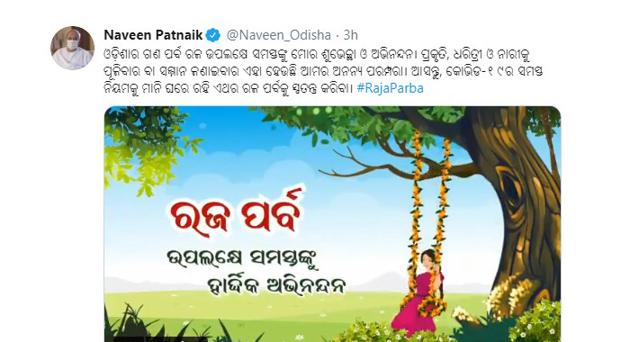 ଭୁବନେଶ୍ୱର,୧୪।୬(ବ୍ୟୁରୋ): ଆଜି ପହିଲି ରଜ। ଏହା ଉପଲକ୍ଷେ ମୁଖ୍ୟମନ୍ତ୍ରୀ ନବୀନ ପଟ୍ଟନାୟକ ସମସ୍ତଙ୍କୁ ଶୁଭେଚ୍ଛା ଜଣାଇଛନ୍ତି। ମୁଖ୍ୟମନ୍ତ୍ରୀ କହିଛନନ୍ତି, ଓଡ଼ିଶାର ଗଣପର୍ବ ରଜ ଉପଲକ୍ଷେ ସମସ୍ତଙ୍କୁ ମୋର ଶୁଭେଚ୍ଛା ଓ ଅଭିନନ୍ଦନ। ପ୍ରକୃତି , ଧରିତ୍ରୀ ଓ ନାରୀକୁ ପୂଜିବାର ବା ସମ୍ମାନ ଜଣାଇବାର ଏହା ହେଉଛି ଆମର ଅନନ୍ୟ ପରମ୍ପରା। ଆସନ୍ତୁ କୋଭିଡ-୧୯ର ସମସ୍ତ ନିୟମକୁ ମାନି ଘରେ ରହି ଏଥର ରଜ ପର୍ବକୁ ସ୍ବତନ୍ତ୍ର କରିବା ବୋଲି ମୁଖ୍ୟମନ୍ତ୍ରୀ କହିଛନ୍ତି।