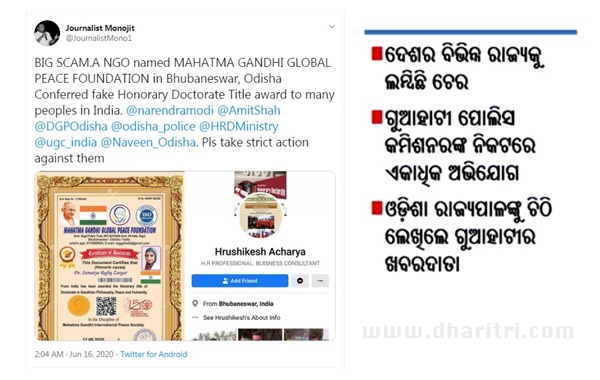 ଅଭିଯୋଗ ଅନୁସାରେ, ବିଜ୍ଞାପନରେ ଥିବା ସଂସ୍ଥାର ନାମ ମହାତ୍ମାଗାନ୍ଧୀ ଗ୍ଲୋବାଲ ପିସ୍ ଫାଉଣ୍ଡେଶନ ରହିଥିବାବେଳେ ପ୍ରତିଷ୍ଠାତା ତଥା ଅନ୍ତର୍ଜାତୀୟ ସଭାପତି ଚିତ୍ତରଞ୍ଜନ ମହାନ୍ତି, ସାଧାରଣ ସମ୍ପାଦକ ଡ. ହୃଷୀକେଶ ଆଚାର୍ଯ୍ୟ ଓ ସେମାନଙ୍କ ଫଟୋ ରହିଛି। ସଂସ୍ଥାର ଠିକଣା ଭୁବନେଶ୍ୱର କଳିଙ୍ଗନଗରର ପ୍ଲଟ୍ ନଂ.କେ୪/୩୭ରେ କାର୍ଯ୍ୟ କରୁଥିବା ଉଲ୍ଲେଖ ରହିଛି। ସେଥିରେ ଦିଆଯାଇଥିବା ଫୋନ୍ ନମ୍ବରରେ ଯୋଗାଯୋଗ କରି ଛାତ୍ରୀଛାତ୍ରମାନେ ଟଙ୍କା ପଠାଇଛନ୍ତି। ହେଲେ ଏହି ଠିକଣାରେ ସେପରି କିଛି ସଂସ୍ଥା ନ ଥିବାବେଳେ ସେଠାରେ ଜଣେ ବ୍ୟକ୍ତି ପରିବାର ସହ ରହୁଥିବା ଜଣାପଡିଛି। ତାଙ୍କ ପାଖକୁ ବହୁତ ଚିଠି ଆସିଥିବାବେଳେ ପୋଲିସ ଓ ଛାତ୍ରୀଛାତ୍ର ଆସି ପଚାରୁଥିବା କହିଛନ୍ତି। ତେବେ ଠକମାନେ ଅନ୍ଲାଇନ୍ରେ ତାଙ୍କ ଘର ଠିକଣା ଦେଇ ବହୁ କୋଟି ଟଙ୍କା ଠକି ନେଇଥିବା ଅନୁମାନ କରାଯାଉଛି। ତେବେ ଦିଆଯାଇଥିବା ଫୋନ୍ ନମ୍ବରରେ ଆମ ପ୍ରତିନିଧି ଯୋଗାଯୋଗ କରିବାରୁ ଜଣେ ବ୍ୟକ୍ତି କଲ୍ ରିସିଭ୍ କରିବା ସହ କଥା ହୋଇଥିଲେ। ପରିଚୟ ପଚାରି ସାର୍ଟିଫିକେଟ ପାଇଁ ୮୦ ହଜାରରୁ ୧ଲକ୍ଷ ଟଙ୍କା ଲାଗିବ ଓ ଲକ୍ଡାଉନ୍ ପାଇଁ କେବଳ ଅନ୍ଲାଇନ୍ରେ ଦିଆଯିବ ବୋଲି କହିଥିଲେ।