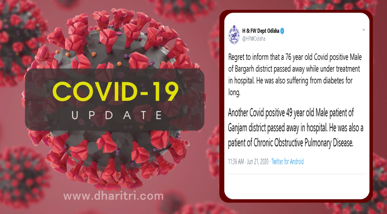 ଭୁବନେଶ୍ୱର,୨୧।୬(ବ୍ୟୁରୋ): ରାଜ୍ୟରେ କରୋନା ନେଲା ଆଉ ୨ଜଣଙ୍କ ଜୀବନ। ମୃତକଙ୍କ ମଧ୍ୟରେ ବରଗଡ଼ ଜିଲାର ଜଣେ ୭୬ ବର୍ଷୀୟ ବୃଦ୍ଧ ଥିବା ବେଳେ ଜଣେ ଗଞ୍ଜାମ ଜିଲାର ୪୯ ବର୍ଷୀୟ ବ୍ୟକ୍ତି ଅଛନ୍ତି। ଏହାକୁ ମିଶାଇ ରାଜ୍ୟରେ କରୋନା ମୃତ୍ୟୁ ସଂଖ୍ୟା ୧୪କୁ ବୃଦ୍ଧି ପାଇଛି। ଏ ନେଇ ରାଜ୍ୟ ସ୍ବାସ୍ଥ୍ୟ ଓ ପରିବାର କଲ୍ୟାଣ ବିଭାଗ ପକ୍ଷରୁ ରବିବାର ପୂର୍ବାହ୍ନରେ ଟୁଇଟ୍ କରି ସୂଚନା ଦିଆଯାଇଛି।