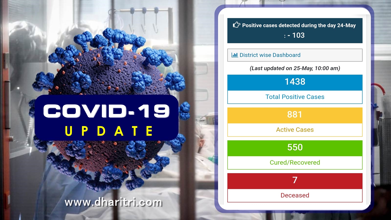 ସୂଚନାଯୋଗ୍ୟ, ରାଜ୍ୟରେ ବର୍ତ୍ତମାନ ସୁଦ୍ଧା ୧୪୩୮ କରୋନା ଆକ୍ରାନ୍ତ ଚିହ୍ନଟ ହୋଇଥିବା ବେଳେ ୮୮୧ ଜଣ ଚିକତ୍ସାଧୀନ ଅଛନ୍ତି। ୫୫୦ ସୁସ୍ଥ ହୋଇଛନ୍ତି। ୭ ଜଣଙ୍କ ମୃତ୍ୟୁ ଘଟିଛି।