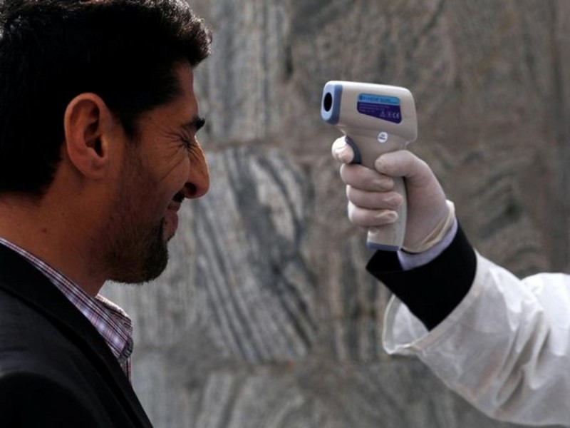 An Afghan health worker in protective gear checks the temperature of a man during Afghanistan's President Ashraf Ghani inauguration as president, at the Presidential Palace in Kabul, Afghanistan March 9, 2020. REUTERS/Mohammad Ismail