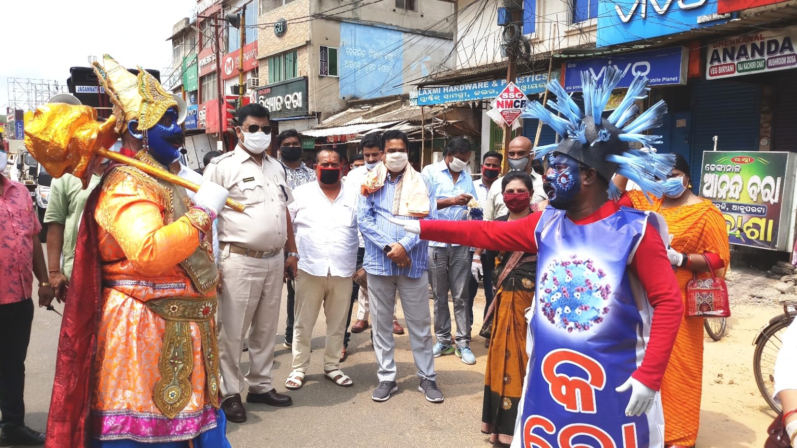 ବିଧାୟକ ସୁଧୀର କୁମାର ସାମଲଙ୍କ ଉପସ୍ଥିତିରେ ଯମରାଜ ବେଶରେ ଦେବାଶିଷ ମିଶ୍ର ଏବଂ କରୋନା ବେଶରେ ବିନୋଦ ମହାନ୍ତି ସ୍ଥାନୀୟ ରଥଗଡ଼ାଠାରୁ ବାଜିଚୌକ ଯାଏ ଚାଲିଚାଲି ଜନସାଧାରଣଙ୍କୁ ସଚେତନ କରାଇଥିଲେ। କରୋନା ସଂକ୍ରମଣ ରୋକିବା ଲାଗି ମାସ୍କ ପିନ୍ଧିବା, ସାମାଜିକ ଦୂରତ୍ୱ ରକ୍ଷା କରିବା, ଜରୁରୀ କାର୍ଯ୍ୟ ନ ଥିଲେ ପଦାକୁ ନ ବାହାରିବା, ସାବୁନରେ ହାତକୁ ଭଲଭାବେ ଧୋଇବା, ଲକ୍‌ଡାଉନ୍‌ ନିୟମ କଡ଼ାକଡ଼ି ଭାବେ ପାଳନ କରିବା ପାଇଁ ସେମାନେ ନିବେଦନ କରିଥିଲେ। ସାମାନ୍ୟ ଭୁଲ୍‌ ପାଇଁ କରୋନା ସମସ୍ତଙ୍କୁ ଗ୍ରାସ କରିବ ବୋଲି କଳାକାରମାନେ ଚେତାବନୀ ଦେଇଥିଲେ। ବାଜିଚୌକ୍‌ରେ ଏହି କାର୍ଯ୍ୟକ୍ରମ ଉଦ୍‌ଯାପିତ ହୋଇଥିଲା। ଏହି ଅବସରରେ କରୋନା ଯୋଦ୍ଧା ଟାଉନ ଥାନାଧିକାରୀ ଜ୍ଞାନରଞ୍ଜନ ସାମଲଙ୍କ ସମେତ ଗଣମାଧ୍ୟମ ପ୍ରତିନିଧିଙ୍କୁ ସମ୍ବର୍ଦ୍ଧିତ କରାଯାଇଥିଲା। ବିଜେଡି ନେତା ନରୋତ୍ତମ ସାହୁ, ଇନ୍ଦ୍ରମଣି ବେହେରା, ସାଇଶ୍ରୀ ପଟ୍ଟନାୟକ, ସାଗରିକା ମିଶ୍ର, ଦେବୀ ପ୍ରସାଦ ଭୂତିଆ, ସୁରଜ ମହାପାତ୍ର, ଶ୍ରୀକାନ୍ତ ଧଳ, ନିରାକାର ରାଉତ, ଅବିନାଶ ଜେନା, ଶଶିକାନ୍ତ ମିଶ୍ର ପ୍ରମୁଖ ଉପସ୍ଥିତ ଥିଲେ। ଏହାପରେ ଜିଲା କାର୍ଯ୍ୟାଳୟରେ ଦୁଇ କଳାକାର ଅଭିନୟ ମାଧ୍ୟମରେ ଅଧିକାରୀ ଏବଂ କର୍ମଚାରୀଙ୍କୁ ସଚେତନ କରାଇଥିଲେ। ଜିଲାପାଳ ଭୂମେଶ ଚନ୍ଦ୍ର ବେହେରା, ଅତିରିକ୍ତ ଜିଲାପାଳ ଭବେଶ ନାୟକ, ପୌର ନିର୍ବାହୀ ଅଧିକାରୀ ଅତନୁ ସାମନ୍ତ ପ୍ରମୁଖ ଉପସ୍ଥିତ ଥିଲେ।