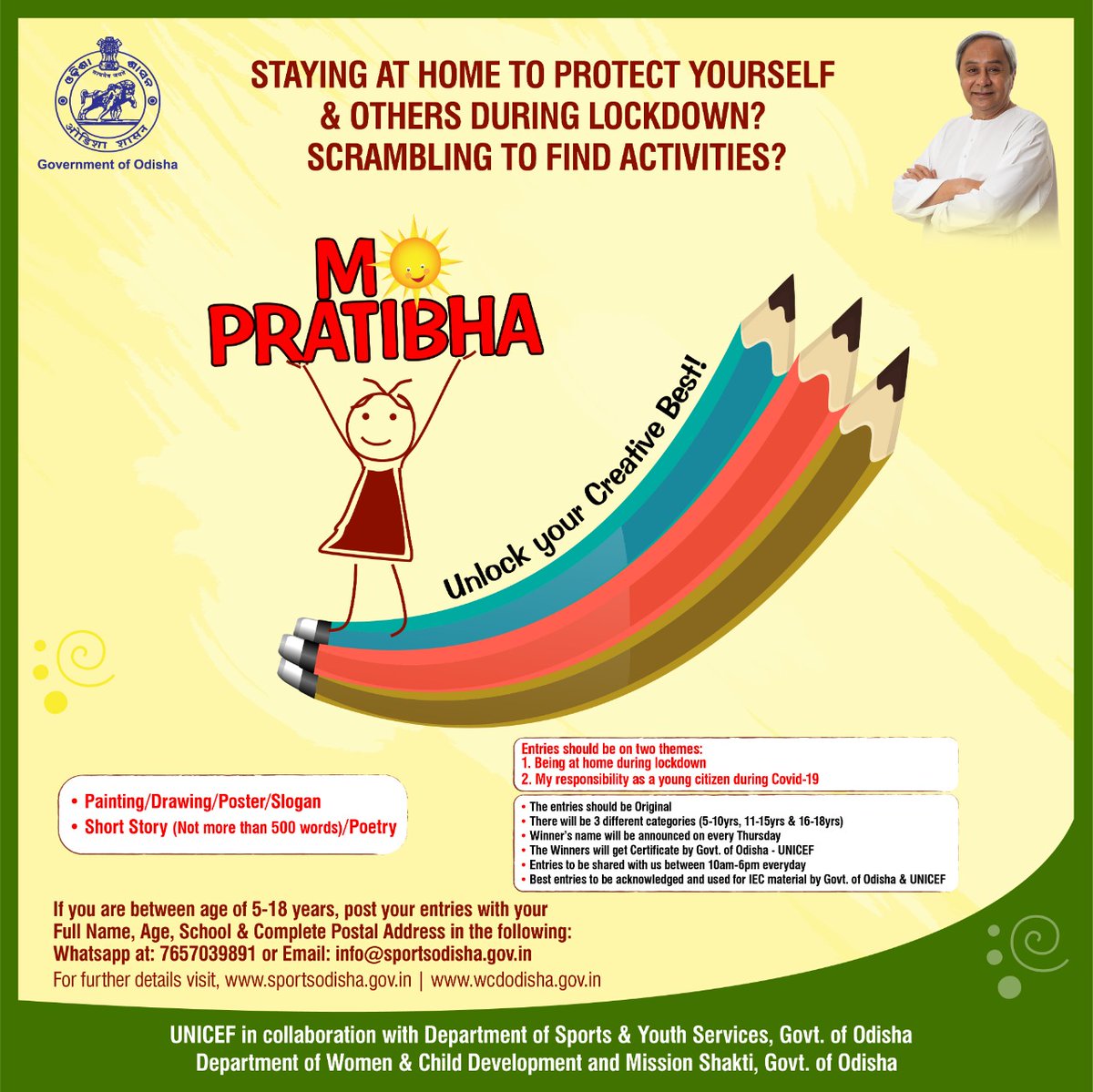 ଭୁବନେଶ୍ୱର,୨ା୪(ବ୍ୟୁରୋ)- କରୋନା ସଂକ୍ରମଣ ବ୍ୟାପିବାକୁ ରୋକିବା ଲାଗି ଦେଶରେ ୨୧ଦିନିଆ ଲକ୍ଡାଉନ୍ ଘୋଷଣା ହୋଇଛି। ଏହାଦ୍ୱାରା ସବୁବର୍ଗର ଲୋକେ ପ୍ରଭାବିତ ହୋଇଛନ୍ତି। ଏପରି କି କୋମଳମତି ଶିଶୁ, ଛୋଟ ପିଲା ଏବଂ ଛାତ୍ରୀଛାତ୍ର ଏଥିରୁ ବାଦ୍ ପଡ଼ି ନାହାନ୍ତି। ସ୍କୁଲ ବନ୍ଦ ରହିଥିବାରୁ ପିଲାମାନେ ପୂରା ସମୟ ଘରେ ରହୁଛନ୍ତି। ଏଭଳିସ୍ଥିତିରେ ଶିଶୁ, କିଶୋର ଏବଂ ଛାତ୍ରୀଛାତ୍ରଙ୍କୁ ଏହି ଲକ୍ଡାଉନ୍ ସମୟରେ ସୃଜନଶୀଳ କାର୍ଯ୍ୟରେ ନିୟୋଜିତ ରଖିବାକୁ ପଦକ୍ଷେପ ନେଇଛନ୍ତି ରାଜ୍ୟ ସରକାର। ପିଲାମାନଙ୍କ ଅନ୍ତର୍ନିହିତ ପ୍ରତିଭାର ବିକାଶ ନିମନ୍ତେ ରାଜ୍ୟ ମହିଳା ଓ ଶିଶୁ ବିକାଶ, ମିଶନ ଶକ୍ତି ବିଭାଗ ଏବଂ କ୍ରୀଡ଼ା ଓ ଯୁବସେବା ବିଭାଗ ସହ ୟୁନିସେଫ୍ର ମିଳତି ସହଯୋଗରେ ‘ମୋ ପ୍ରତିଭା’ ନାମକ ଏକ ଅନ୍ଲାଇନ୍ ପ୍ରତିଯୋଗିତାର ଆୟୋଜନ କରିବାକୁ ସ୍ଥିର ହୋଇଛି।