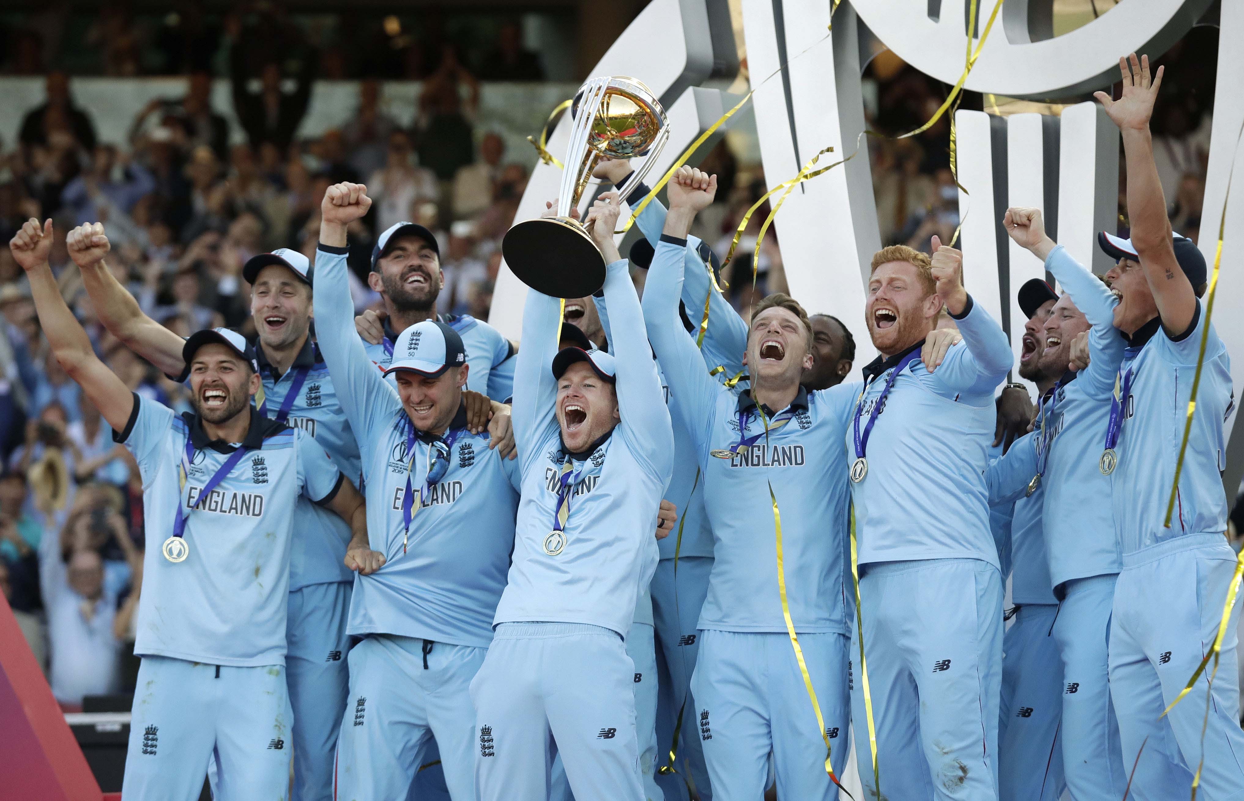 London: England's captain Eoin Morgan raises the trophy after winning the Cricket World Cup final match between England and New Zealand at Lord's cricket ground in London, Sunday, July 14, 2019. England won after a super over after the scores ended tied after 50 overs each. AP/PTI Photo(AP7_15_2019_000013B)