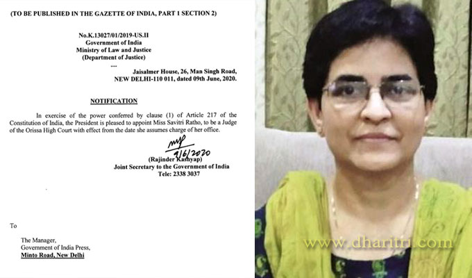 କଟକ ଅଫିସ,୯।୬: ବରିଷ୍ଠ ଆଇନଜୀବୀ ସାବିତ୍ରୀ ରଥଙ୍କୁ ଓଡ଼ିଶା ହାଇକୋର୍ଟର ନୂଆ ବିଚାରପତି ଭାବେ ନିଯୁକ୍ତି ଦିଆଯାଇଛି। ଏ ନେଇ କେନ୍ଦ୍ର ଆଇନ ମନ୍ତ୍ରଣାଳୟ ପକ୍ଷରୁ ବିଜ୍ଞପ୍ତି ପ୍ରକାଶ ପାଇଛି। ରଥଙ୍କ ନାମକୁ ହାଇକୋର୍ଟର କଲେଜିୟମ ଗତବର୍ଷ ମେ’ରେ ସୁପ୍ରିମକୋର୍ଟର କଲେଜିୟମକୁ ସୁପାରିଶ କରିଥିଲେ। ଏହା ପରେ ଗତ ଜାନୁଆରୀରେ ସୁପ୍ରିମକୋର୍ଟର କଲେଜିୟମ ତାଙ୍କ ନାମକୁ ଆଇନ ମନ୍ତ୍ରଣାଳୟକୁ ସୁପାରିଶ କରିଥିଲେ।