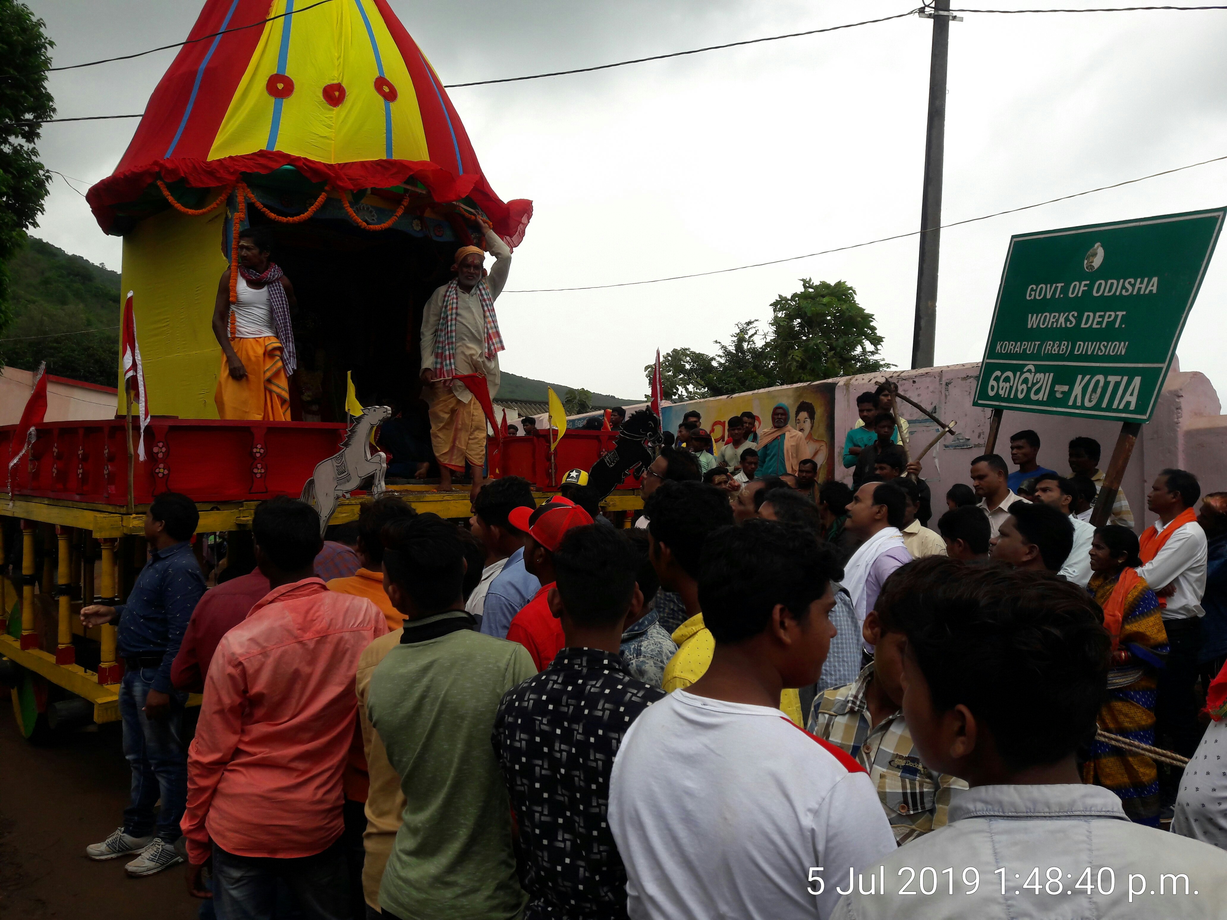 ପଟ୍ଟାଙ୍ଗି,୫।୭(ଡି.ଏନ୍.ଏ.): ସାରା ରାଜ୍ୟରେ ଯେଉଁଦିନ ରଥଯାତ୍ରା ହୁଏ, ତାହା ପରଦିନ ପଟ୍ଟାଙ୍ଗି ବ୍ଲକ ସୀମାନ୍ତ କୋଟିଆ ପଞ୍ଚାୟତରେ ଗଡ଼େ ଶ୍ରୀଜୀଉଙ୍କ ରଥ। ୨୦୦୨ ମେ’ ୧ରେ ଗଜପତି ମହାରାଜାଙ୍କ ଦ୍ୱାରା ଏଠାରେ ମନ୍ଦିର ପ୍ରତିଷ୍ଠା ହେବା ପରଠାରୁ ଦୀର୍ଘ ବର୍ଷ ଧରି ଏହି ନିଆରା ପରମ୍ପରା ଚଳିଆସୁଛି। ଗୁରୁବାର ପହଣ୍ଡି କରି ତିନି ଠାକୁରଙ୍କୁ ରଥାରୂଢ଼ କରାଯାଇଥିଲା। ଶୁକ୍ରବାର ଶାବର ଶ୍ରୀକ୍ଷେତ୍ର ପୂଜକ ପ୍ରଶାନ୍ତ ପଣ୍ଡା ପୂଜାର୍ଚ୍ଚନା କରିବା ପରେ ପରମ୍ପରା ଅନୁଯାୟୀ ସିଦ୍ଧେଶ୍ୱର ଗେମେଲ ଛେରା ପହଁରା କରିଥିଲେ। ପ୍ରଭୁ ଜଗନ୍ନାଥଙ୍କ ସ୍ଥାୟୀ ପୂଜକ ମୁଗୁରି ତାଡିଙ୍ଗି ସହଯୋଗ କରିଥିଲେ। ଏହାପରେ ଡାହୁକ ପଠାଣି ସାହୁଙ୍କ ଡାକର ତାଳରେ ସ୍ଥାନୀୟ ଭକ୍ତ ଅପରାହ୍ନ ଗୋଟାଏରେ ରଥଟଣା ଆରମ୍ଭ କରିଥିଲେ। କୋଟିଆ ପ୍ରାଥମିକ ସ୍ବାସ୍ଥ୍ୟକେନ୍ଦ୍ର ନିକଟସ୍ଥ ଜଗନ୍ନାଥ ମନ୍ଦିରରୁ ରଥ ଟାଣି ତିନି ଠାକୁରଙ୍କୁ ଅଙ୍ଗନଓ୍ବାଡ଼ି କେନ୍ଦ୍ରରେ ହୋଇଥିବା ମାଉସୀ ମା’ ମନ୍ଦିରରେ ଅପରାହ୍ନ ୨ଟା ୧୫ରେ ପହଞ୍ଚାଇଥିଲେ ଭକ୍ତ। ଏହି ଅବସରରେ ପଟ୍ଟାଙ୍ଗି ବିଧାୟକ ପ୍ରୀତମ ପାଢ଼ୀ, କୋରାପୁଟ ବିଧାୟକ ରଘୁରାମ ପଡାଲ, ପୂର୍ବତନ ବିଧାୟକ ପ୍ରଫୁଲ୍ଲ ପାଙ୍ଗି, ପୂର୍ବତନ ବିଧାୟିକା ଚନ୍ଦ୍ରମା ସାନ୍ତା, ପଞ୍ଚାୟତ ସମିତି ଅଧ୍ୟକ୍ଷ ଜଗତଜ୍ୟୋତି ପାଙ୍ଗି, ଜିଲା ପରିଷଦ ଅଧ୍ୟକ୍ଷ ତୁଳସୀ କିର୍ସାନି, ବିଡିଓ କରୁଣାକର ପ୍ରଧାନ, ତହସିଲଦାର ଡ. ଅରୁଣ ଖଣ୍ଡା, ଗୋଷ୍ଠୀ ସ୍ବାସ୍ଥ୍ୟକେନ୍ଦ୍ର ଅଧିକାରୀ ଡାକ୍ତର ଭାଗବତ ମୁର୍ମୁ ଶ୍ରୀଜୀଉଙ୍କ ଦର୍ଶନ କରିଥିଲେ।