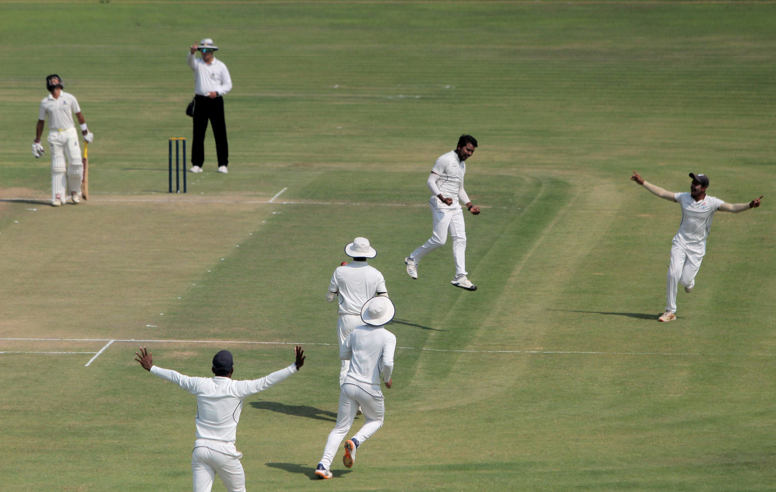 CUTTACK, DRIEMS, 20/02/2020: Odisha players celebrate after taking West Bengal’s Manoj Tiwari’s wicket in the ranji quarter final match at Drieams ground in Cuttack. Photo: Biswaranjan Rout