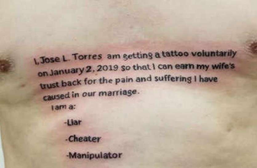 ସ୍ବାମୀ ଜଣଙ୍କ ସ୍ତ୍ରୀଙ୍କୁ ଧୋକ୍କା ଦେଇଥିଲେ। ଏହା ପରେ ସ୍ତ୍ରୀ ତାଙ୍କୁ ଛାଡ଼ି ଚାଲିଗଲେ। କିନ୍ତୁ ବ୍ୟକ୍ତିଜଣକ ଚାହୁଁ ନ ଥିଲେ ସ୍ତ୍ରୀଙ୍କଠାରୁ ଦୂରେଇ ରହିବାକୁ। ସ୍ତ୍ରୀଙ୍କୁ ଫେରି ପାଇବା ପାଇଁ ସେ ଏକ ଭିନ୍ନ ତରିକା ଆପଣାଇଛନ୍ତି। ଦିଲ୍ଲୀର ଟୋରେସ୍ ନାମକ ଜଣେ ବ୍ୟକ୍ତି ନିଜ ଛାତିରେ ଟାଟୁ ଆଙ୍କି ଲେଖିଛନ୍ତି, ମୁଁ ଧୋକାବାଜ, ମିଛୁଆ, ବେଇମାନ ଏବଂ ସମ୍ମାନ କରୁ ନ ଥିବା ବ୍ୟକ୍ତି। ତୁମେ ମୋତେ କ୍ଷମା କରି ମୋ’ ପାଖକୁ ଫେରିଆସ। ଖାଲି ଲେଖିନାହାନ୍ତି ଛାତିର ଫଟୋ ଉଠାଇ ସୋସିଆଲ ମିଡିଆରେ ଶେୟାର ବି କରିଛନ୍ତି। ଏହାକୁ ଦେଖି କିଛି ୟୁଜର ସ୍ବାମୀଙ୍କ ପାଖକୁ ଫେରିଯିବାକୁ ସ୍ତ୍ରୀଙ୍କୁ ନିବେଦନ କରିଛନ୍ତି। ଆଉ କିଛି ୟୁଜର ଲେଖିଛନ୍ତି, ଏମିତି ଲୋକଙ୍କୁ କ୍ଷମା ମିଳିବା ଉଚିତ୍ ନୁହେଁ।
