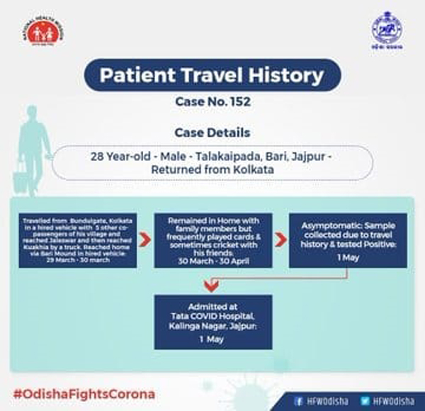 ସୂଚନାଯୋଗ୍ୟ, ୧୫୨ ନଂ. କରୋନା ଆକ୍ରାନ୍ତ ଜଣକ କୋଲକାତାର ବୁନ୍ଦୁଲଗେଟ୍ରୁ ୨୯ ମାର୍ଚ୍ଚରେ ବାହାରି ଅନ୍ୟ ୫ଜଣ ସହକର୍ମୀଙ୍କ ସହିତ ଏକ ଭଡ଼ାଗାଡ଼ିରେ ୩୦ ମାର୍ଚ୍ଚରେ ପହଞ୍ଚିଥିଲେ। ସେଠାରୁ ଏକ ଟ୍ରକ ଯୋଗେ ଯାଜପୁର ଜିଲା କୁଆଖିଆରେ ପହଞ୍ଚିବା ପରେ ଏକ ଭଡ଼ାଗାଡ଼ିରେ ବରୀମାଉଣ୍ଟ ଦେଇ ନିଜ ଗ୍ରାମକୁ ଆସିଥିଲେ। ଏହି ୫ ଜଣଙ୍କ ମଧ୍ୟରୁ ସଂକ୍ରମିତ ଯୁବକ ଜଣକ ନିଜ ପରିବାର ସହ ଘରେ ରହି ବିଭିନ୍ନ ସାଙ୍ଗସାଥୀଙ୍କ ସହିତ ତାସ୍ ଏବଂ କ୍ରିକେଟ ଖେଳିଥିଲେ। ୩୦ ମାର୍ଚ୍ଚରୁ ୩୦ ଏପ୍ରିଲ ପର୍ଯ୍ୟନ୍ତ ବରୀ ଅଞ୍ଚଳର ବିଭିନ୍ନ ବ୍ୟକ୍ତିଙ୍କ ସଂସ୍ପର୍ଶରେ ଆସିଥିବାର ସୂଚନା ମିଳିଛି। ତାଙ୍କର ସ୍ବାବ୍ ଟେଷ୍ଟ ପରେ ରକ୍ତ ନମୁନା ପଜିଟିଭ୍ ଆସିବା ପରେ ତାଙ୍କୁ ପ୍ରଶାସନ ପକ୍ଷରୁ ୧ ତାରିଖରେ ଯାଜପୁରର କଳିଙ୍ଗ ନଗର ଟାଟା କୋଭିଡ୍ ହସ୍ପିଟାଲରେରେ ଭର୍ତ୍ତି କରାଯାଇଥିଲା।