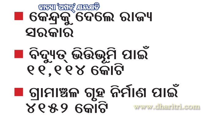 ଭୁବନେଶ୍ୱର,୨୩।୬(ବ୍ୟୁରୋ): ସାମୁଦ୍ରିକ ଝଡ଼ ‘ଅମ୍ଫନ୍’ ଯୋଗୁ ଉପକୂଳବର୍ତ୍ତୀ ଜିଲାରେ ହୋଇଥିବା କ୍ଷୟକ୍ଷତିର ଭରଣା ପାଇଁ ରାଜ୍ୟ ସରକାର ୧୬,୨୩୫ କୋଟି ଟଙ୍କାର ଚୂଡ଼ାନ୍ତ ରିପୋର୍ଟ କେନ୍ଦ୍ର ସରକାରଙ୍କୁ ପ୍ରଦାନ କରିଛନ୍ତି। କେନ୍ଦ୍ରାପଡ଼ା, ଜଗତ୍ସିଂହପୁର, ବାଲେଶ୍ୱର ଏବଂ ଭଦ୍ରକ ଜିଲାରେ ବାତ୍ୟା ନିରୋଧ ବିଦ୍ୟୁତ୍ ଭିତ୍ତିଭୂମି ପାଇଁ ୧୧, ୧୧୪ କୋଟି, ଗ୍ରାମାଞ୍ଚଳ ଗୃହ ନିର୍ମାଣ ପାଇଁ ୪୧୫୨ କୋଟି, ସମୁଦ୍ର ପାଣି ଅଟକାଇବାକୁ ଲୁଣାବନ୍ଧ ପାଇଁ ୭୬୭ କୋଟି ଏବଂ ରିଲିଫ ଓ ଥଇଥାନ ପାଇଁ ୨୦୨ କୋଟି ଟଙ୍କାର ପ୍ରସ୍ତାବ ପ୍ରଦାନ କରାଯାଇଥିବା ସ୍ବତନ୍ତ୍ର ରିଲିଫ କମିଶନର ପ୍ରଦୀପ କୁମାର ଜେନା ସୂଚନା ଦେଇଛନ୍ତି।