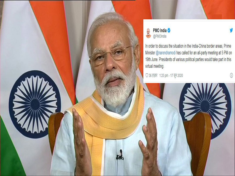 ନୂଆଦିଲ୍ଲୀ, ୧୭।୬: ଭାରତ ଚାଇନା ମଧ୍ୟରେ ଉତ୍ତେଜନା ସୃଷ୍ଟି ହେବାର ୩୬ ଘଣ୍ଟା ପରେ ସରକାର ମୁହଁ ଖୋଲିଛନ୍ତି। ପ୍ରଧାନମନ୍ତ୍ରୀ ନରେନ୍ଦ୍ର ମୋଦି ଜୁନ ୧୯ ଅପରାହ୍ନ ୫ରେ ସର୍ବଦଳୀୟ ବୈଠକ ପାଇଁ ଟୁଇଟ୍ କରି ସୂଚନା ଦେଇଛନ୍ତି। ଏଥିରେ ସମସ୍ତ ରାଜନୈତିକ ଦଳର ନେତାମାନେ ଉପସ୍ଥିତ ରହିବେ। ଭିଡ଼ିଓ କନଫରେନ୍ସିଂରେ ଏହି ବୈଠକ କରାଯିବ। ବୁଧବାର ଅପରାହ୍ନ ୧ଟା ୨୫ରେ ମୋଦି ଟୁଇଟ୍ କରି ଏହି ସୂଚନା ଦେଇଛନ୍ତି।