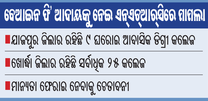 ଯାଜପୁର ଅଫିସ,୩।୨: ସେଲ୍ଫ ଫାଇନାନ୍ସିଂ ସ୍କିମ ନାମରେ ରାଜ୍ୟ ସରକାରଙ୍କ ଉଚ୍ଚ ଶିକ୍ଷାର ବ୍ୟବସାୟୀକରଣ ଯୋଗୁ ରାଜ୍ୟରେ ବହୁ ପ୍ରତିଷ୍ଠିତ ଘରୋଇ ଆବାସିକ ଡିଗ୍ରୀ କଲେଜଗୁଡ଼ିକରେ ଛାତ୍ରୀଛାତ୍ରଙ୍କ ଠାରୁ ବେଆଇନ ଫି’ ଆଦାୟ ଚାଲିଛି। ଏନେଇ ଜାତୀୟ ମାନବାଧିକାର କମିଶନ(ଏନ୍ଏଚ୍ଆର୍ସି)ରେ ମାମଲା ରୁଜୁ ହେବାପରେ ଭୁବନେଶ୍ୱର ଆଞ୍ଚଳିକ ଶିକ୍ଷା ନିର୍ଦ୍ଦେଶାଳୟ(ଆର୍ଡିଇ) ଅଧୀନସ୍ଥ ୬୧ଟି ଘରୋଇ ଆବାସିକ କଲେଜର ଅଧ୍ୟକ୍ଷ/ପ୍ରିନ୍ସିପାଲଙ୍କୁ ଜବାବ ତଲବ କରାଯାଇଛି। ଏଥିମଧ୍ୟରୁ ଯାଜପୁର ଜିଲାର ୯ଟି ଆବାସିକ ଡିଗ୍ରୀ କଲେଜ ବେଆଇନ ଫି’ ଆଦାୟ କରୁଥିବା ଜଣାପଡ଼ିଛି।