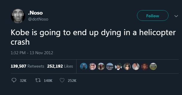କାର୍ଲିଫର୍ଣ୍ଣିଆ,୨୭।୧: ପ୍ରସିଦ୍ଧ ବାସ୍କେଟବଲ ଖେଳାଳି କୋବେ ବ୍ରାଏଣ୍ଟଙ୍କ ଏକ ହେଲିକପ୍ଟର ଦୁର୍ଘଟଣାରେ ମୃତ୍ୟୁ ଘଟିଛି। ହଠାତ୍ ତାଙ୍କ ମୃତ୍ୟୁ ଖବର ଆସିବା ପରେ ଆମେରିକାରେ ଶୋକର ଛାୟା ଖେଳିଯାଇଛି। ହେଲିକପ୍ଟର ଦୁର୍ଘଟଣାରେ ତାଙ୍କ ମୃତ୍ୟୁ ହେବ ବୋଲି ୨୦୧୨ରେ ଜଣେ ବ୍ୟକ୍ତି ଟୁଇଟ୍ ଯୋଗେ ଭବିଷ୍ୟବାଣୀ କରିଥିଲେ। ନୋସୋ ନାମକ ଜଣେ ବ୍ୟକ୍ତିଙ୍କ ଏହି ଟୁଇଟ୍ ଏବେ ସୋସିଆଲ ମିଡିଆରେ ଭାଇରାଲ ହେବାରେ ଲାଗିଛି। ସୂଚନାଯୋଗ୍ୟ, ନୋସୋ ୨୦୧୨ ମସିହା ନଭେମ୍ବର ୧୩ରେ ଟୁଇଟ୍ କରିଥିଲେ କି କୋବେ ବ୍ରାଏଣ୍ଟଙ୍କ ହେଲିକପ୍ଟର ଦୁର୍ଘଟଣାରେ ମୃତ୍ୟୁ ହେବ। ଯାହା ଏବେ ସତ ହୋଇଛି। ୫ ଥର ଏନବିଏ ଚାମ୍ପିଅନ ହୋଇଥିବା ବ୍ରାଏଣ୍ଟ ଏକ ବେସରକାରୀ ହେଲିକପ୍ଟରେ ଯାଉଥିବାବେଳେ ତାହା ଏକ ପାହାଡରେ ପିଟି ହୋଇ ଦୁର୍ଘଟଣା ଘଟିଥିଲା। ଏଥିରେ ବାଏଣ୍ଟ ଏବଂ ତାଙ୍କ ୧୩ ବର୍ଷର ଝିଅ ଜିଆନାଙ୍କ ସମେତ ୭ଜଣଙ୍କ ମୃତ୍ୟୁ ଘଟିଛି।