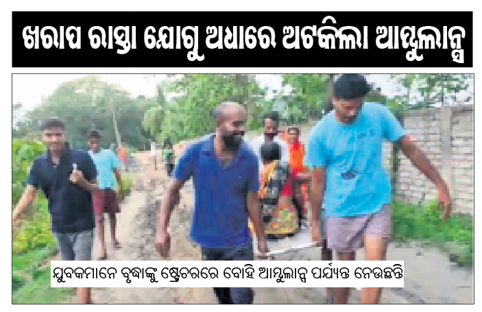 ଭଦ୍ରକ ଅଫିସ,୩୦।୬: ଝାଡ଼ାବାନ୍ତି ହେଉଥିବା ଜଣେ ବୃଦ୍ଧାଙ୍କୁ ଡାକ୍ତରଖାନା ନେବାକୁ ୧୦୮ ଆମ୍ବୁଲାନ୍ସ ଆସିଥିଲା। ହେଲେ ରାସ୍ତା ଖରାପ ଯୋଗୁ ଗଁାକୁ ଯାଇ ନ ପାରି ୧ କି.ମି. ପୂର୍ବରୁ ଆମ୍ବୁଲାନ୍ସ ଅଟକି ରହିଥିଲା। ଫଳରେ ଷ୍ଟ୍ରେଚରରେ ଉକ୍ତ ବୃଦ୍ଧାଙ୍କୁ ୧ କି.ମି. ବୋହି ନେବାକୁ ପଡ଼ିଥିଲା। ଭଦ୍ରକ ଜିଲା ବନ୍ତ ବ୍ଲକ ରାମପୁର ପଞ୍ଚାୟତର କାଜିପୋଖରୀ ଚାରିତିରା ଗ୍ରାମରେ ଏଭଳି ଘଟଣା ଦେଖିବାକୁ ମିଳିଛି। ଏହାର ଭିଡିଓ ଏବେ ସୋସିଆଲ ମିଡିଆରେ ଭାଇରାଲ ହୋଇଛି।