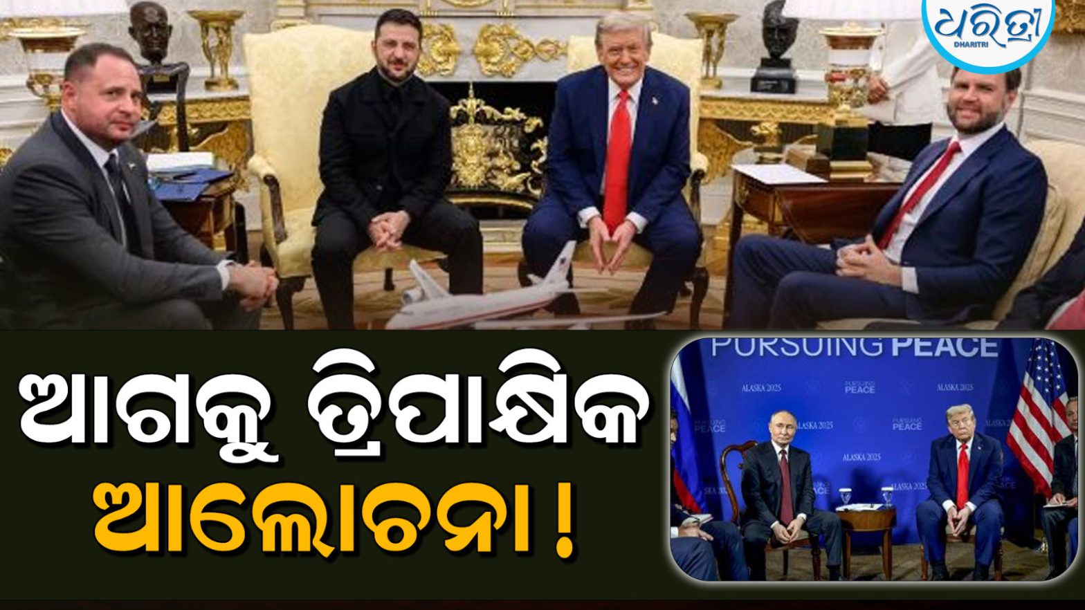 ଓ୍ବାଶିଂଟନ,୧୯।୮: ସାଢ଼େ ତିନି ବର୍ଷ ଧରି ଚାଲିଥିବା ୟୁକ୍ରେନ ଯୁଦ୍ଧର ଅନ୍ତ ପାଇଁ ସୋମବାର ଆଉ ଏକ ପାଦ ଆଗକୁ ବଢ଼ିଛି। ୟୁକ୍ରେନର ରାଷ୍ଟ୍ରପତି ଭୋଲୋଡିମିର ଜେଲେନସ୍କି ଭାରତୀୟ ସମୟ ଅନୁସାରେ ସୋମବାର ରାତି ୧୧ଟାରେ ହ୍ବାଇଟ ହାଉସରେ ପହଞ୍ଚି ଆମେରିକା ରାଷ୍ଟ୍ରପତି ଡୋନାଲ୍ଡ ଟ୍ରମ୍ପଙ୍କ ସହ ପ୍ରାୟ ୪୫ ମିନିଟ ଧରି ଆଲୋଚନା କରିଥିଲେ। ଆଲୋଚନାରେ ଜେଲେନସ୍କି ୟୁକ୍ରେନରେ ଶାନ୍ତି ପାଇଁ ନିଜର ଇଚ୍ଛା ପ୍ରକାଶ କରିଥିଲେ ଏବଂ କହିଥିଲେ ଯେ ଏଥିପାଇଁ ରୁଷିଆ ରାଷ୍ଟ୍ରପତି ଭ୍ଲାଦିମିର ପୁଟିନଙ୍କ ସହ ସିଧାସଳଖ ଆଲୋଚନା ଆବଶ୍ୟକ।
