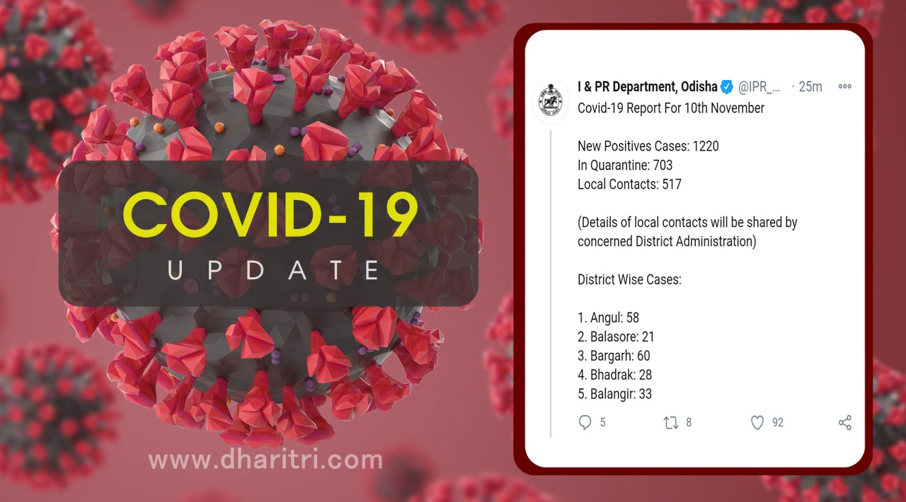 ଭୁବନେଶ୍ୱର, ୧୧।୧୧(ବ୍ୟୁରୋ): ରାଜ୍ୟରେ ବୁଧବାର ପୁଣି ୧୨୨୦ ନୂଆ କରୋନା ପଜିଟିଭ ଚିହ୍ନଟ ହୋଇଛନ୍ତି। ଏହାକୁ ମିଶାଇ ରାଜ୍ୟରେ ମୋଟ ଆକ୍ରାନ୍ତଙ୍କ ସଂଖ୍ୟା ୩୦୫୦୦୦ ହଜାରରେ ପହଞ୍ଚିଛି। ଏନେଇ ରାଜ୍ୟ ସୂଚନା ଓ ଲୋକ ସମ୍ପର୍କ ବିଭାଗ ପକ୍ଷରୁ ସୂଚନା ଦିଆଯାଇଛି। ତେବେ ନୂଆ ଆକ୍ରାନ୍ତଙ୍କ ମଧ୍ୟରୁ ୭୦୩ କ୍ୱାରାଣ୍ଟାଇନ ସେଣ୍ଟରରୁ ଚିହ୍ନଟ ହୋଇଥିବା ବେଳେ ୫୧୭ ଲୋକାଲ କେସ୍ ରହିଛି।