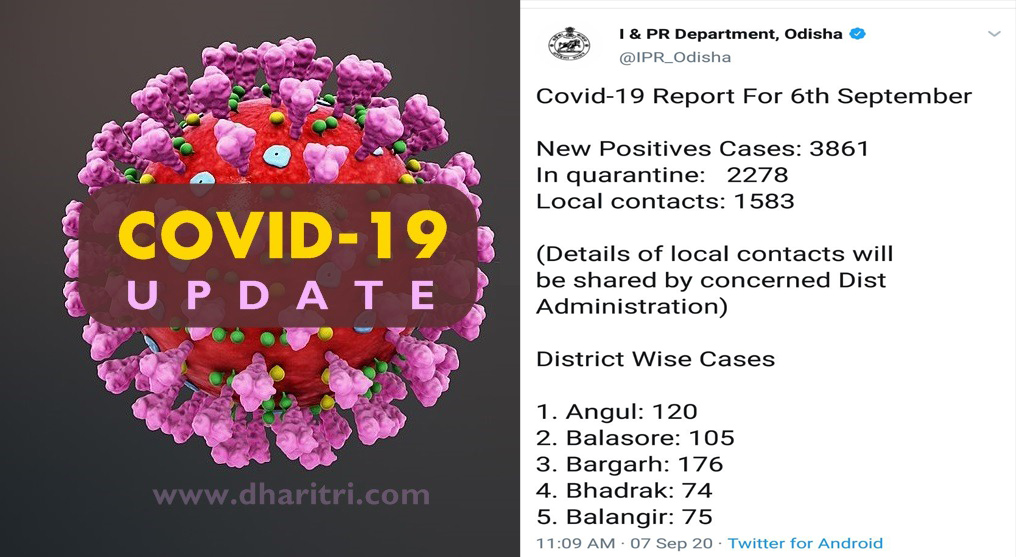 ଭୁବନେଶ୍ୱର,୭ା୯(ବ୍ୟୁରୋ): ସୋମବାର ମୋଟ୍ ୩୦ ଜିଲାରୁ ୩,୮୬୧ ନୂଆ ପଜିଟିଭ୍ ଚିହ୍ନଟ ହୋଇଛନ୍ତି। ଏହାକୁ ମିଶାଇ ରାଜ୍ୟରେ ମୋଟ୍ ଆକ୍ରାନ୍ତଙ୍କ ସଂଖ୍ୟା ୧, ୨୭,୮୯୨ରେ ପହଞ୍ଚିଥିବା ରାଜ୍ୟ ସୂଚନା ଓ ଲୋକ ସମ୍ପର୍କ ବିଭାଗ ସୂଚନା ଦେଇଛି। ଏଥିମଧ୍ୟରୁ କ୍ୱାରାଣ୍ଟାଇନ୍ରୁ ୨୨୭୮ ଜଣ ଚିହ୍ନଟ ହୋଇଥିବା ବେଳେ ୧୫୮୩ ଜଣ ସ୍ଥାନୀୟ ସଂକ୍ରମିତ ଅଟନ୍ତି।