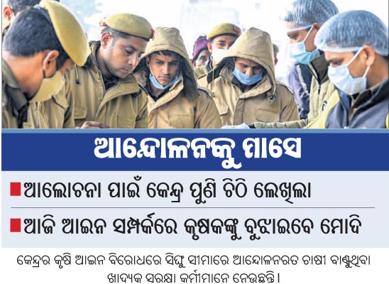ଏସବୁକୁ ଦୃଷ୍ଟିରେ ରଖି କଂଗ୍ରେସର ଏକ ପ୍ରତିନିଧି ଦଳ ଗୁରୁବାର ରାଷ୍ଟ୍ରପତି ରାମନାଥ କୋବିନ୍ଦଙ୍କ ହସ୍ତକ୍ଷେପ ଲୋଡ଼ିଛି। ୩ କୃଷି ଆଇନକୁ ପ୍ରତ୍ୟାହାର କରିବା ପାଇଁ ପାର୍ଲାମେଣ୍ଟର ଏକ ମିଳିତ ଅଧିବେଶନ ଡାକିବାକୁ ଦଳ ରାଷ୍ଟ୍ରପତିଙ୍କୁ ଅନୁରୋଧ କରିଛି। ସେପଟେ ଦିଲ୍ଲୀରେ ତାପମାତ୍ରା ଲଗାତର ଭାବେ କମିବାରେ ଲାଗିଥିବାବେଳେ ସିଙ୍ଘୁ, ଗାଜିପୁର ଓ ଟିକ୍ରି ସୀମାରେ ହଜାର ହଜାର ଚାଷୀ ଶୀତ କାକର ସହି ନିଜ ଦାବିରେ ଅଡ଼ିବସିଛନ୍ତି। କେନ୍ଦ୍ର ସରକାର ଗୁରୁବାର ଆନ୍ଦୋଳନରତ କୃଷକ ସଙ୍ଗଠନଗୁଡ଼ିକୁ ଆଲୋଚନା ପାଇଁ ପୁଣି ଥରେ ଚିଠି ଲେଖି ଆମନ୍ତ୍ରଣ କରିଛନ୍ତି। କୃଷି ମନ୍ତ୍ରଣାଳୟ ଯୁଗ୍ମ ସଚିବ ବିବେକ ଅଗ୍ରଓ୍ବାଲଙ୍କଠାରୁ ୪୦ କୃଷକ ନେତାଙ୍କ ପାଖକୁ ଉକ୍ତ ଚିଠି ପଠାଯାଇଛି। ସରକାର ସବୁ ପ୍ରସଙ୍ଗରେ ଖୋଲା ହୃଦୟରେ ଆଲୋଚନା ପାଇଁ ପ୍ରସ୍ତୁତ। ତେଣୁ ପରବର୍ତ୍ତୀ ପର୍ଯ୍ୟାୟ ଆଲୋଚନା ତାରିଖ ସ୍ଥିର କରିବାକୁ ଚିଠିରେ ଅନୁରୋଧ କରାଯାଇଛି। ପ୍ରକାଶ ଯେ, ପୂର୍ବରୁ ୫ ପର୍ଯ୍ୟାୟରେ କେନ୍ଦ୍ର-କୃଷକଙ୍କ ମଧ୍ୟରେ ବୈଠକ ହୋଇଥିଲା। ତେବେ ଉଭୟ ପକ୍ଷ ନିଜ ଜିଦ୍ରେ ଅଡ଼ିବସିଥିବାରୁ ଆଲୋଚନା ନିଷ୍ଫଳ ହୋଇଥିଲା। ପୂର୍ବତନ ପ୍ରଧାନମନ୍ତ୍ରୀ ଅଟଳ ବିହାରୀ ବାଜପେୟୀଙ୍କ ଜୟନ୍ତୀ ଅବସରରେ ଶୁକ୍ରବାର ମୋଦି ୯ କୋଟି ଚାଷୀଙ୍କ ସହ ଭର୍ଚୁଆଲ ବୈଠକ କରିବେ। କୃଷି ଆଇନ ଆଣିବା ପଛରେ କେନ୍ଦ୍ରର ଲକ୍ଷ୍ୟ ସମ୍ପର୍କରେ ସେ ଚାଷୀମାନଙ୍କୁ ବୁଝାଇବା ସହ ପିଏମ୍-କିଷାନ ଯୋଜନାରେ ପରବର୍ତ୍ତୀ ପର୍ଯ୍ୟାୟ ଆର୍ଥତ୍କ ସହାୟତା ସ୍ବରୂପ ୧୮,୦୦୦ କୋଟି ଟଙ୍କା ପ୍ରଦାନ କରିବେ।
