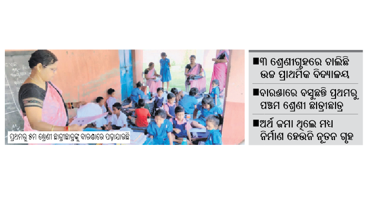 ବୈଶାଖ ମାସର ଟାଣ ଖରାରେ ଛୋଟ ପିଲାମାନେ ସ୍କୁଲ ବାରଣ୍ଡାରେ ବସି ପାଠ ପଢ଼ୁଛନ୍ତି। ୮ଟି କ୍ଲାସ ପାଇଁ ମାତ୍ର ୪ଜଣ ଶିକ୍ଷକ ଅଛନ୍ତି। ନୂତନ ଶ୍ରେଣୀଗୃହ ଓ ଶିକ୍ଷକ ନିଯୁକ୍ତି ପାଇଁ ସରକାର ତୁରନ୍ତ ବ୍ୟବସ୍ଥା କରନ୍ତୁ।