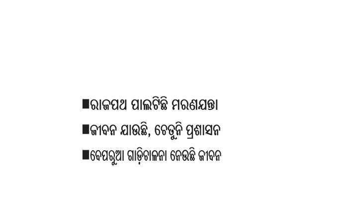 ଜାତୀୟ ରାଜପଥରେ ପୋଲିସ ପାଟ୍ରୋଲିଂ ଏବଂ ଇଣ୍ଟରସେପ୍ଟର ବ୍ୟବସ୍ଥା ରହିଛି। ତେବେ ଏହା କେବଳ ଜରିମାନାରେ ସୀମିତ। ତେବେ ରାତିରେ ଭାରିଯାନ ଚଳାଚଳ ଉପରେ କୌଣସି ନିୟନ୍ତ୍ରଣ ନାହିଁ। ଦ୍ରୁତ ଗାଡିଚାଳନା ଏବଂ ରାତିର ଘନ ଅନ୍ଧକାରରେ ଦୁର୍ଘଟଣା ଘଟି ଜୀବନ ଯାଉଛି। ଗୋଟିଏ ପଟେ ରାଜ୍ୟ ସରକାରଙ୍କ ସମସ୍ତ ପ୍ରଚେଷ୍ଟା ସତ୍ତ୍ୱେ ଜୀବନ ଯାଉଛି। ଅନ୍ୟପଟେ ବିଭାଗୀୟ ଅଧିକାରୀମାନେ ଜଣେ ଅନ୍ୟ ଉପରକୁ ଦୋଷ ଲଦି ଖସିଯିବାକୁ ଉଦ୍ୟମ କରୁଛନ୍ତି। ଫଳରେ ଜାତୀୟ ରାଜପଥରେ ଯାତ୍ରା ସୁରକ୍ଷିତ ନୁହଁ ବୋଲି ବିଭିନ୍ନ ମହଲରେ ପ୍ରକାଶ ପାଇଛି। ଖୋର୍ଦ୍ଧା ଜିଲାପାଳଙ୍କ କାର୍ଯ୍ୟାଳୟ ଠାରୁ ପଲା ତୋଟାପଡା ପର୍ଯ୍ୟନ୍ତ ରାସ୍ତାରେ ନିର୍ମାଣ କାର୍ଯ୍ୟ ଜାରି ରହିଛି। ଫଳରେ ଏଠାରୁ ପଲ୍ଲା ତୋଟାପଡା ଛକ ପର୍ଯ୍ୟନ୍ତ ଉଭୟ ପଟ ରାସ୍ତା ସଙ୍କୁଚିତ ରହିଛି। ପୁଣି ତୋଟାପଡା ଛକରେ ଏକ ମୁହଁା ରାସ୍ତା ଯୋଗୁ ସମସ୍ତ ଭାରିଯାନ ଯାତାୟାତ କରୁଛନ୍ତି। ଫଳରେ ଏହି ରାସ୍ତା ଏବେ ମରଣାଯନ୍ତା ପାଲଟିଛି। ସେହିଭଳି ରାଜପଥରେ ଟାଙ୍ଗୀ ପର୍ଯ୍ୟନ୍ତ ଚାଲିଥିବା ରାଜପଥ କାର୍ଯ୍ୟ ତ୍ୱରାନ୍ବିତ ଲାଗି ସାଧାରଣରେ ଦାବି ହୋଇଛି। ଏ ସମ୍ପର୍କରେ ଆଞ୍ଚଳିକ ପରିବହନ ଅତିରିକ୍ତ ପରିବହନ ଅଧିକାରୀ ଅରବିନ୍ଦ ନାୟକ କୁହନ୍ତି, ପରିବହନ ବିଭାଗର ନିର୍ଦ୍ଦେଶକ୍ରମେ ଏପ୍ରିଲ ପହିଲାରୁ ସପ୍ତାହ ବ୍ୟାପୀ ଦୁର୍ଘଟଣା ଶୂନ ସପ୍ତାହ ପାଳନ ଅବସରରେ ଲକ୍ଷାଧିକ ଟଙ୍କା ଜରିମାନା କରାଯାଇଛି। ନାବାଳକଙ୍କ ଗାଡିଚାଳନା ଉପରେ ନଜର ରଖାଯାଇଛି। ପୂର୍ବରୁ ସଡ଼କ ସୁରକ୍ଷା ସପ୍ତାହ ଅବସରରେ ବିଭିନ୍ନ ସ୍ଥାନରେ ସଚେତନତା କାର୍ଯ୍ୟକ୍ରମ ଆୟୋଜନ କରାଯାଇଥିଲା। ଦୁର୍ଘଟଣା କମିବା ପାଇଁ ମାନସିକତାରେ ପରିବର୍ତ୍ତନ ଜରୁରୀ। ଲୋକେ ସଚେତନ ହେଲେ ଦୁର୍ଘଟଣା କମିବ ବୋଲି ସେ କହିଛନ୍ତି।