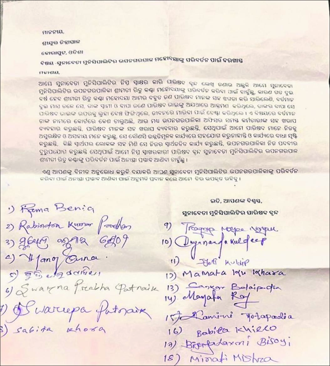 ସୁନାବେଡା/ସେମିଳିଗୁଡା,୯ା୭(କୃତ୍ତିବାସ ପ୍ରଧାନ /ବାସୁଦେବ ବରାଡ଼):ସୁନାବେଡ଼ା ପୌର ପରିଷଦ ଉପାଧ୍ୟକ୍ଷା ଋତୁ କଣ୍ଟାଙ୍କ ବିରୋଧରେ ଅନାସ୍ଥା ପ୍ରସ୍ତାବ ପାଇଁ ପରିଷଦର ୧୮ କାଉନସିଲର କୋରାପୁଟ ଜିଲାପାଳଙ୍କ ନିକଟରେ ଫେରାଦ ହୋଇଛନ୍ତି। ସମସ୍ତ କାଉନସିଲରଙ୍କ ଦସ୍ତଖତ ସମ୍ବଳିତ ଏକ ଅଭିଯୋଗପତ୍ର ଜିଲାପାଳ ଭି.କୀର୍ତ୍ତି ଭାସନଙ୍କୁ ପ୍ରଦାନ କରାଯାଇଛି। ଉପାଧ୍ୟକ୍ଷା କାଉନସିଲରମାନଙ୍କୁ କାର୍ଯ୍ୟାଳୟରେ ଦୁର୍ବ୍ୟବହାର କରିବା ସହ ଅପଦସ୍ଥ କରୁଛନ୍ତି। ପରିଷଦର ବହୁ କାଉନସିଲରଙ୍କ ସହ ତାଙ୍କର ଝଗଡ଼ା ହେଉଛି। ୨ ମାସ ତଳେ ତାଙ୍କ ସ୍ବାମୀ ଏବଂ ବାପା ମିଶି ଜଣେ କାଉନସିଲରଙ୍କୁ ଜୀବନରେ ମାରିଦେବାର ଧମକ ଦେଇ ମରଣାନ୍ତକ ଆକ୍ରମଣ କରିଥିଲେ। ଏନେଇ କୋର୍ଟରେ ମାମଲା ଚାଲୁ ରହିଛି। ପରିଷଦର ଅଧିକାରୀ ଏବଂ କର୍ମଚାରୀଙ୍କୁ ଖରାପ ବ୍ୟବହାର ଯୋଗୁ ସମସ୍ତେ ନିଜକୁ ଅସୁରକ୍ଷିତ ମନେ କରୁଛନ୍ତି ବୋଲି ଅଭିଯୋଗପତ୍ରରେ ଉଲ୍ଲେଖ ରହିଛି। ଉପାଧ୍ୟକ୍ଷା କୌଣସି ଉନ୍ନତିମୂଳକ କାର୍ଯ୍ୟରେ ସହଯୋଗ କରିବା ବଦଳରେ ବାଧା ସୃଷ୍ଟି କରି ସ୍ବାର୍ଥ ହାସଲ ପାଇଁ ନିଜ ପଦବୀର ଦୁରୁପଯୋଗ କରୁଥିବା ଭଳି ଅଭିଯୋଗ କାଉନସିଲରମାନେ ଆଣିଛନ୍ତି। ଏହି କାରଣରୁ ଉପାଧ୍ୟକ୍ଷା ପଦବୀର ପରିବର୍ତ୍ତନ ନିମନ୍ତେ ଅନାସ୍ଥା ପ୍ରସ୍ତାବକୁ ଅନୁମତି ପାଇଁ ଜିଲାପାଳଙ୍କୁ ନିବେଦନ କରିଛନ୍ତି । ଏ ସମ୍ପର୍କରେ ଉପାଧ୍ୟକ୍ଷା କଣ୍ଟାଙ୍କୁ ପଚାରିବାରୁ ସେ କହିଛନ୍ତି, ଅଭିଯୋଗ ସମ୍ପର୍କରେ ସେ କିଛି ଜାଣିନାହାନ୍ତି। ତେବେ ତାଙ୍କ ବିରୋଧରେ ହୋଇଥିବା ଅଭିଯୋଗ ଭିତ୍ତିହୀନ ବୋଲି ସେ ପ୍ରକାଶ କରିଛନ୍ତି।