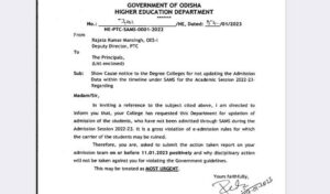 ୨୦୨୨-୨୩ ଶିକ୍ଷା ବର୍ଷରେ ଯେଉଁ ଛାତ୍ରୀଛାତ୍ର ସାମ୍ସ ମାଧ୍ୟମରେ ନାମ ଲେଖାଇ ନ ଥିଲେ ସେମାନଙ୍କ ନାଁ ନାମଲେଖା ତାଲିକାରେ ସାମିଲ କରିବାକୁ ଏହି ୧୯ ଡିଗ୍ରୀ କଲେଜ ପକ୍ଷରୁ ଉଚ୍ଚଶିକ୍ଷା ବିଭାଗକୁ ଅନୁରୋଧ କରାଯିବା ପରେ ବିଭାଗ ପକ୍ଷରୁ ଏହି କାରଣ ଦର୍ଶାଅ ନୋଟିସ ପଠାଯାଇଛି।