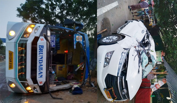 ମାଧପୁର, ୨।୧୧: ଅନୁଗୋଳ ଜିଲା ଆଠମଲ୍ଲିକ ବ୍ଲକ ଅନ୍ତର୍ଗତ କିଆକଟା ଥାନାର କିଆକଟା ବୌଦ୍ଧ ତ୍ରିବେଣୀ ଛକରେ ରବିବାର ବିଳମ୍ବିତ ରାତିରେ ଏକ ମର୍ମନ୍ତୁଦ ସଡ଼କ ଦୁର୍ଘଟଣା ଘଟିଛି। ଏକ ଇନୋଭା ଉପରେ ଯାତ୍ରୀବାହୀ ବସ୍ ଭାରସାମ୍ୟ ହରାଇ ଓଲଟିପଡ଼ିବାରୁ ଘଟଣାସ୍ଥଳରେ ୨ ଜଣଙ୍କର ମୃତ୍ୟୁ ଘଟିଛି। ୧୨ ଗୁରୁତର ହୋଇଛନ୍ତି।