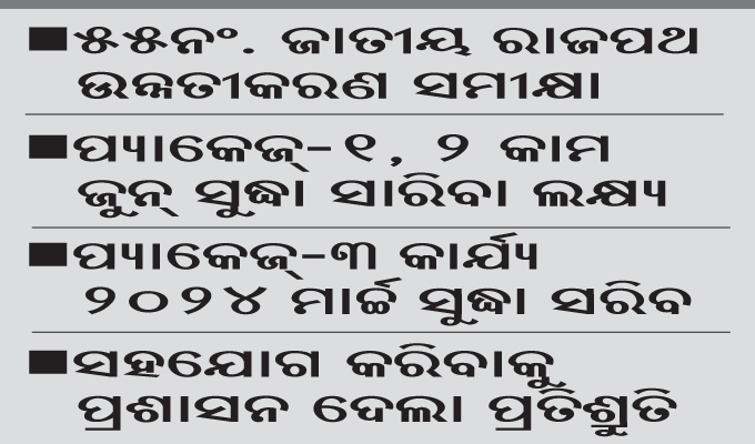 ବୈଠକରେ ହୋଇଥିବା ଆଲୋଚନା ପର୍ଯ୍ୟାଲୋଚନାରୁ ଜଣାପଡ଼ିଛି ଯେ, ୫୫ନଂ. ଏନ୍ଏଚ୍ କାର୍ଯ୍ୟ ତ୍ୱରାନ୍ବିତ କରିବାକୁ ପ୍ରଶାସନ ପକ୍ଷରୁ ସମସ୍ତ ସହଯୋଗ କରାଯାଉଛି। ବୈଠକରେ ହୋଇଥିବା ନିଷ୍ପତ୍ତି ଅନୁଯାୟୀ ପ୍ଲାନ ଏବଂ କାର୍ଯ୍ୟକ୍ରମ ନିର୍ଦ୍ଧାରଣ କରି ସମସ୍ତ କାର୍ଯ୍ୟ ଶେଷ କରିବା ପାଇଁ ଗାୟତ୍ରୀ ଠିକାସଂସ୍ଥା, ଏନ୍ଏଚ୍ଏଆଇ ପ୍ରକଳ୍ପ ନିର୍ଦ୍ଦେଶକଙ୍କୁ କୁହାଯାଇଛି। ଜନସାଧାରଣଙ୍କ ବୃହତ୍ତର ସ୍ବାର୍ଥକୁ ଦୃଷ୍ଟିରେ ରଖି ଯଥାସମ୍ଭବ ରାସ୍ତା ମରାମତି କରି ଯାନବାହନ ଚଳାଚଳ ଲାଗି ସୁବିଧା କରିବାକୁ ଠିକାସଂସ୍ଥା ଓ ଏନ୍ଏଚ୍ଏଆଇ ଅଧିକାରୀଙ୍କୁ କୁହାଯାଇଛି। ରାସ୍ତା ନିର୍ମାଣ କାର୍ଯ୍ୟ ଯେପରି ନିର୍ଦ୍ଧାରିତ ସମୟ ମଧ୍ୟରେ ଶେଷ ହୋଇପାରିବ ସେଥିଲାଗି ଆବଶ୍ୟକ ସମସ୍ତ ସହଯୋଗ କରାଯିବ ବୋଲି ଢେଙ୍କାନାଳ ଜିଲାପାଳ ସରୋଜ କୁମାର ସେଠୀ ଏବଂ ଅନୁଗୋଳ ଜିଲାପାଳ ସିଦ୍ଧାର୍ଥ ଶଙ୍କର ସ୍ବାଇଁ ପ୍ରତିଶ୍ରୁତି ଦେଇଛନ୍ତି। ଏନ୍ଏଚ୍ଏଆଇ ପ୍ରକଳ୍ପ ନିର୍ଦ୍ଦେଶକ ଏ. ଶ୍ରୀନିବାସ ରାଓ ପାଓ୍ବାର ପଏଣ୍ଟ ପ୍ରେଜେଣ୍ଟେଶନ ମାଧ୍ୟମରେ ରାସ୍ତା ଉନ୍ନତୀକରଣର ଅଗ୍ରଗତି ସମ୍ପର୍କରେ ତଥ୍ୟ ଉପସ୍ଥାପନା କରିଥିଲେ। ରାଜପଥ ସମ୍ପ୍ରସାରଣ ଶେଷ ହେବା ଲାଗି ସର୍ବାଧିକ ଗୁରୁତ୍ୱ ଦେବାକୁ ଏସ୍ପି ଏଲ୍. ଦିବ୍ୟା ଭି., ଏନ୍ଏଚ୍ଏଆଇ ସିଜିଏମ୍ ରାମ ପ୍ରସାଦ ପଣ୍ଡା ବିଭାଗୀୟ ଅଧିକାରୀଙ୍କୁ ପରାମର୍ଶ ଦେଇଛନ୍ତି। ବୈଠକରେ ଢେଙ୍କାନାଳ ଜିଲା ବନଖଣ୍ଡ ଅଧିକାରୀ ଡ. ପ୍ରକାଶଚାନ୍ଦ ଗୋଗିନେନି, ସମ୍ବଲପୁର ଜିଲା ଅତିରିକ୍ତ ଜିଲାପାଳ ଉମାକାନ୍ତ ରାଜ, ଗାୟତ୍ରୀ ଠିକାସଂସ୍ଥା ବରିଷ୍ଠ ପରିଚାଳକ, ବିଭାଗୀୟ ଅଧିକାରୀ, ଯନ୍ତ୍ରୀ ଏବଂ କର୍ମଚାରୀ ଉପସ୍ଥିତ ଥିଲେ।