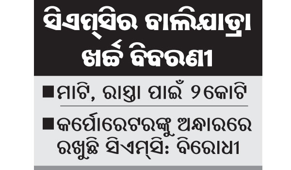 କଟକ ଅଫିସ,୨୩ା୧୧: ବାଲିଯାତ୍ରାରେ ଅନିୟମିତତା ଅଭିଯୋଗରେ ଜିଲା ପ୍ରଶାସନ ବିବାଦରେ ଥିବା ବେଳେ ଏବେ ଏହା ଭିତରକୁ ଟାଣି ହୋଇଆସିଛି କଟକ ମହାନଗର ନିଗମ(ସିଏମ୍ସି) ା ବିରୋଧୀ କର୍ପୋରେଟର ଅଭିଯୋଗ କରିଛନ୍ତି ଯେ ଏହି ବାଲିଯାତ୍ରାରେ ପ୍ରାୟ ୯ କୋଟି ଟଙ୍କା ଖର୍ଚ୍ଚ ହୋଇଥିବା ବେଳେ ସିଏମ୍ସି ଏହାର ତିନି ଭାଗରୁ ଗୋଟିଏ ଭାଗର ରିର୍ପୋଟ ପ୍ରଦାନ କରିଛି ା ବାଲିଯାତ୍ରାରେ ସମୁଦାୟ କେତେ ଟଙ୍କା ଖର୍ଚ୍ଚ ହୋଇଛି ସିଏମ୍ସି କର୍ପୋରେଟରମାନଙ୍କୁ ଖର୍ଚ୍ଚର ବିବରଣୀ ପ୍ରଦାନ କରୁନାହିଁ ା ଏପରିକି ବାଲିଯାତ୍ରା ପାଇଁ ସିଏମ୍ସି ପକ୍ଷରୁ କରାଯାଇଥିବା ସବ୍ କମିଟିଗୁଡିକୁ ମଧ୍ୟ କୌଣସି ଗୁରୁତ୍ୱ ଦିଆଯାଇ ନାହିଁ ା ସବ କମିଟିକୁ ଆୟ ଏବଂ ବ୍ୟୟକୁ ନେଇ ଅନ୍ଧାରରେ ରଖାଯାଉଛି ବୋଲି ଅଭିଯୋଗ ହେଉଛି ା