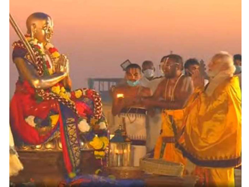 ହାଇଦ୍ରାବାଦ୍, ୫।୨ : ଏକାଦଶ ଶତାବ୍ଦୀର ସନ୍ଥ ରାମାନୁଜାଚାର୍ଯ୍ୟଙ୍କର ୨୧୬ ଫୁଟ ଉଚ୍ଚ ଷ୍ଟାଚ୍ୟୁ ଅଫ୍ ଇକ୍ୱାଲିଟି ଲୋକାର୍ପିତ ହୋଇଛି। ପ୍ରଧାନମନ୍ତ୍ରୀ ନରେନ୍ଦ୍ର ମୋଦି ଏହାକୁ ଲୋକାର୍ପଣ କରିଛନ୍ତି। ମିଶ୍ରଧାତୁରେ ନିର୍ମିତ ଏହି ମୂର୍ତ୍ତି ରାମଶାବାଦ୍ଠାରେ ୪୫ ଏକର ପରିମିତ ଅଞ୍ଚଳରେ ନିର୍ମିତ ମନ୍ଦିର ପରିସରରେ ସ୍ଥାପନା କରାଯାଇଛି। ଏଥିରେ ସୁନା,ରୁପା, ପିତ୍ତଳ, ତମ୍ବା, ଦସ୍ତା ଆଦି ୫ଟି ଧାତୁ ରହିଛି। ପ୍ରତିମାକୁ ୬୪ ଫୁଟ ଉଚ୍ଚ ଆଧାରରେ ସ୍ଥାପିତ କରାଯାଇଛି।