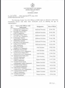 ଭୁବନେଶ୍ୱର,୨୨।୬(ଅସମାପିକା ସାହୁ): ଅବସର ନେଇଛନ୍ତି ୨୨ ଓଏସଏସ କ୍ୟାଡର ଅଧିକାରୀ।ଏନେଇ ଗୃହ ବିଭାଗ ନୋଟିସ ଜାରି କରିଛି।